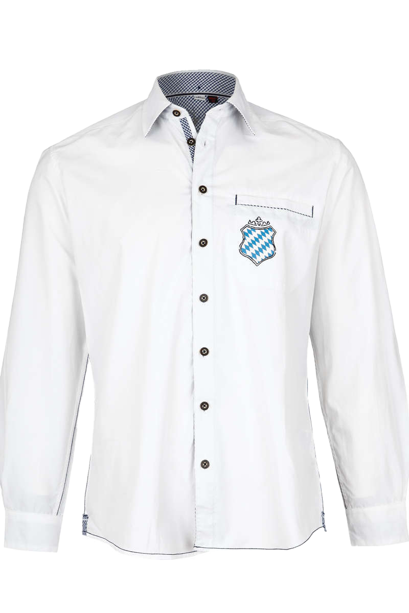 Dieses trendige weiße Hemd besticht durch kleine Details. Die Innenseite des Kragens, die Ärmelmanschetten Innenseite, sowie die Innenseite der Knopfleiste und die Abschlüsse an den Seiten des Hemdes sind in einem blau kariertem Stoff gearbeitet. Innerhlab der Ärmelmanschette befindet sich klein und dezent "Bayern" eingestickt. Diverse Nähte sind dunkelblau gearbeitet. Das Hemd verfügt über eine Brusttasche auf welcher ein Wappen mit der weiß blauen Bayern-Raute aufgedruckt ist. Auf der Rückseite des rechten Ärmels ist eine blaue Stickerei in Form eines Hirschkopfes und dem Spruch "Do bin i dahom" angebracht. Die Knöpfe des Hemdes sind in Hirschhornoptik gehalten.