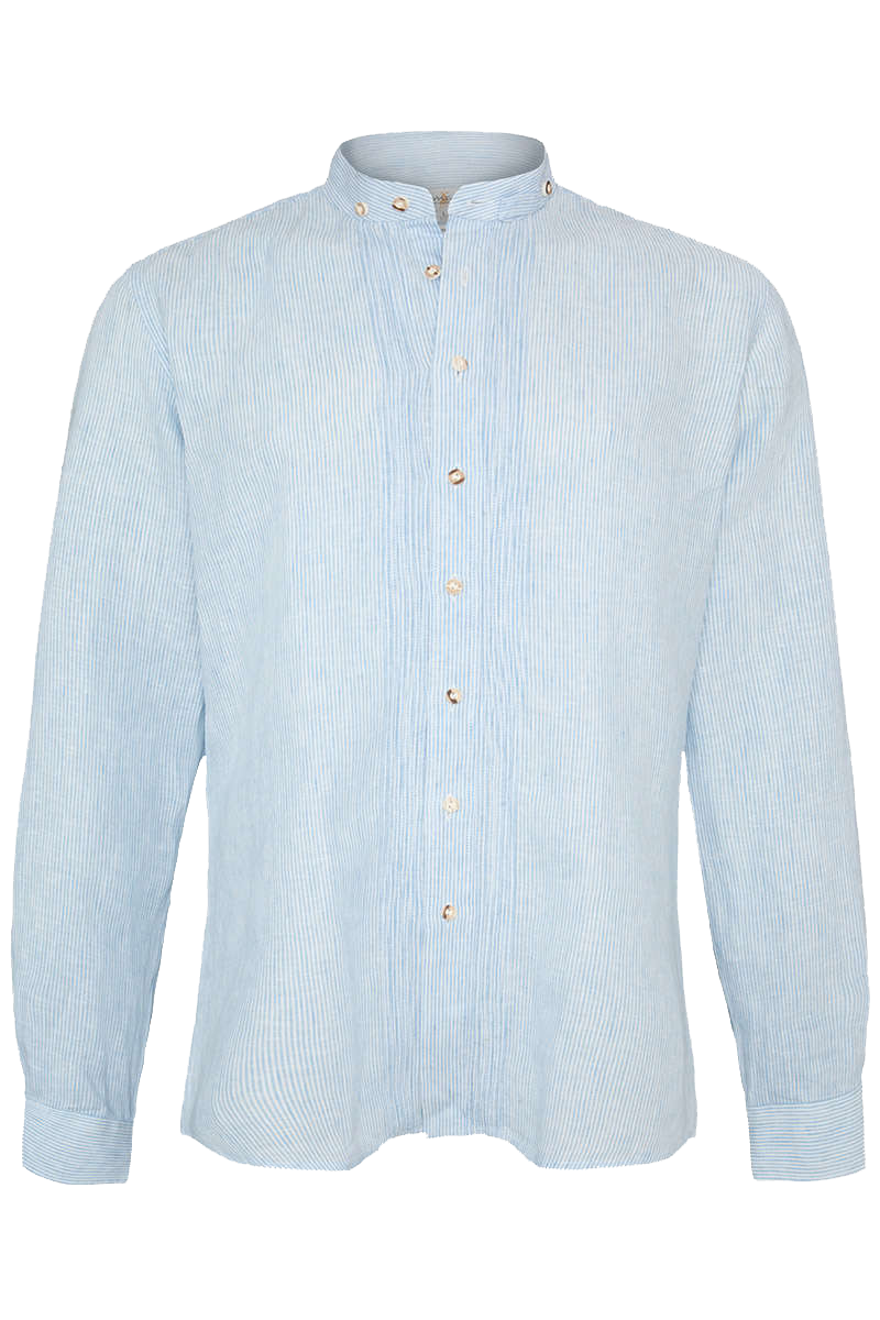 Dieses feingestreifte Leinenhemd der Marke Almsach ist in Hellblau/Lightblue gehalten. Das Hemd wird mit Knöpfen in Hirschhornoptik geschlossen. Beidseitig sind neben der Knopfleiste mehrere Biesen eingearbeitet.Das figurbetonteTrachtenhemd ist mit einem Stehkragen mit Riegel ausgestattet.
