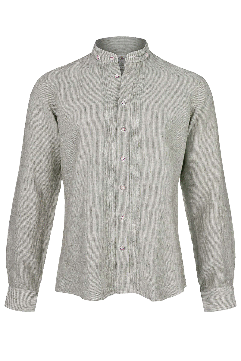 Dieses feingestreifte Leinenhemd der Marke Almsach ist in Oliv gehalten. Das Hemd wird mit Knöpfen in Hirschhornoptik geschlossen. Beidseitig sind neben der Knopfleiste mehrere Biesen eingearbeitet.Das figurbetonteTrachtenhemd ist mit einem Stehkragen mit Riegel ausgestattet.