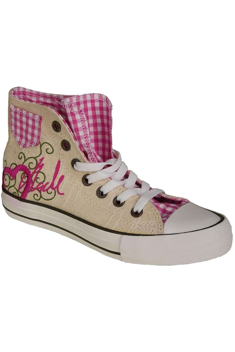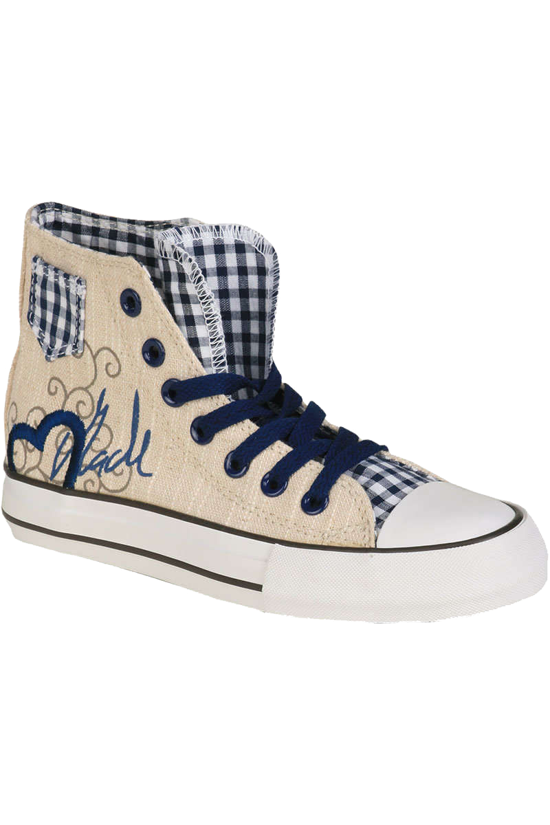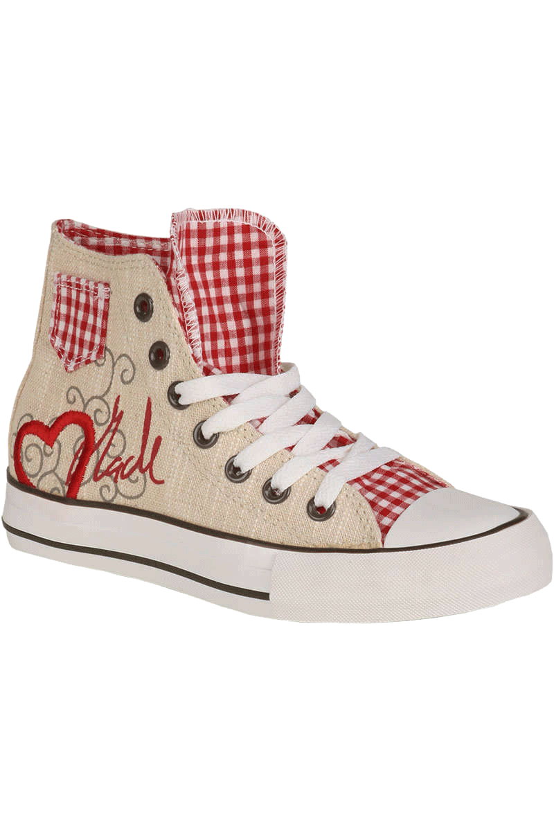 DER Trend des Jahres für fesche Madln!!Warum noch in unbequemen Pumps auf der Bierbank tanzen, wenn es auch bequem, aber trotzdem stylisch geht?Dieser Trachtensneaker im Chucks-Look sind in diesem Sommer und zur Wiesnzeit einfach unerlässlich. Supercooler und bequemer Sneaker im Trachtenlook, mit der aufgedruckten Aufschrift 'Madl' und einen gestickten Herz an der Schuhaußenseite. An der Schuhinnenseite sind zwei Herzen eingestickt. Die Schuhoberkante kann umgeklappt werden. Dadurch kommt das fesche rot-karierte Innenfutter zum Vorschein.
