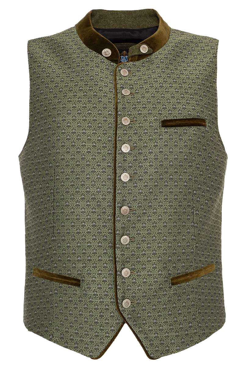 JOHANN von Hammerschmid ist eine festlich elegante Trachtenweste in grün. Der Schnitt wird von einer hochgeschlossenen Knopfleiste mit Metallknöpfen in Münzoptik geprägt. Der Hauptstoff besitzt ein kleinteiliges Ornamentmuster in hellgrün und weiß. Die Paspeln an den Außentaschen und der Knopfleiste sind aus Samt gefertigt, ebenso wie der Stehkragen. Weitere Highlights sind die geknöpfte Lasche am Stehkragen, die Innentasche an der linken Brust und der Rücken, der ebenfalls aus dem Stoff der Front hergestellt ist. Das Design der Weste ist im körpernahen Slim-Fit-Schnitt gehalten.