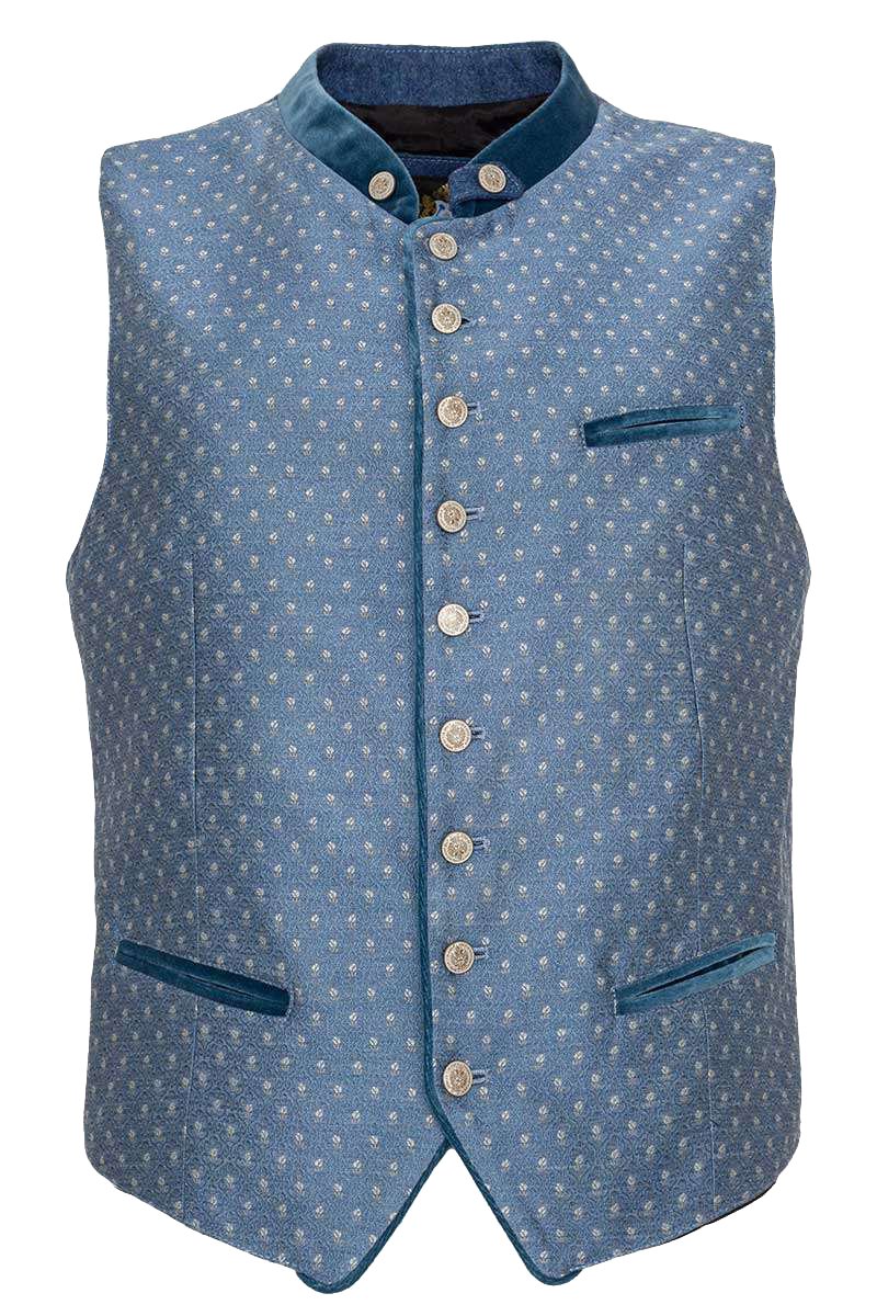 JOHANN von Hammerschmid ist eine festlich elegante Trachtenweste in blau. Der Schnitt wird von einer hochgeschlossenen Knopfleiste mit Metallknöpfen in Münzoptik geprägt. Der Hauptstoff besitzt ein kleinteiliges Blumenmuster in weiß. Die Paspeln an den Außentaschen und der Knopfleiste sind aus Samt gefertigt, ebenso wie der Stehkragen. Weitere Highlights sind die geknöpfte Lasche am Stehkragen, die Innentasche an der linken Brust und der Rücken, der ebenfalls aus dem Stoff der Front hergestellt ist. Das Design der Weste ist im körpernahen Slim-Fit-Schnitt gehalten.
