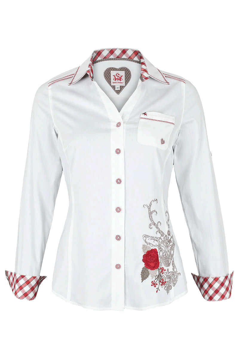 Diese moderne weiße Bluse besticht durch ihre vielen verspielten Details. Sie ist leicht tailliert geschnitten und sitzt perfekt durch die Taillenabnäher und die Rückenpasse. Die Außenseite des Kragens, die Innenseite des Kragens und die Ärmelmanschetteninnenseite sind auffällig mit unterschiedlich gemustertem Stoff abgesetzt. An den Ärmeln sind karierte Riegel angebracht mit denen man die Ärmel hochkrempeln kann. Auf der linken vorderen Seite der Bluse ist ein verspielter Hirschkopf als Print angebracht. Dieser ist in hellbrauner, glitzernder Farbe gearbeitet. Neben dem Hirschkopf ist eine große Rose und ein paar weitere Blumen mitsamt Blättern eingestickt. Die Knöpfe der Bluse sowie die Zierstreifen in rot-weiß kariertem Stoff gearbeitet. Die Brusttasche ist mit einem kleinen in Rot und Braun eingestickten Herz verziert.