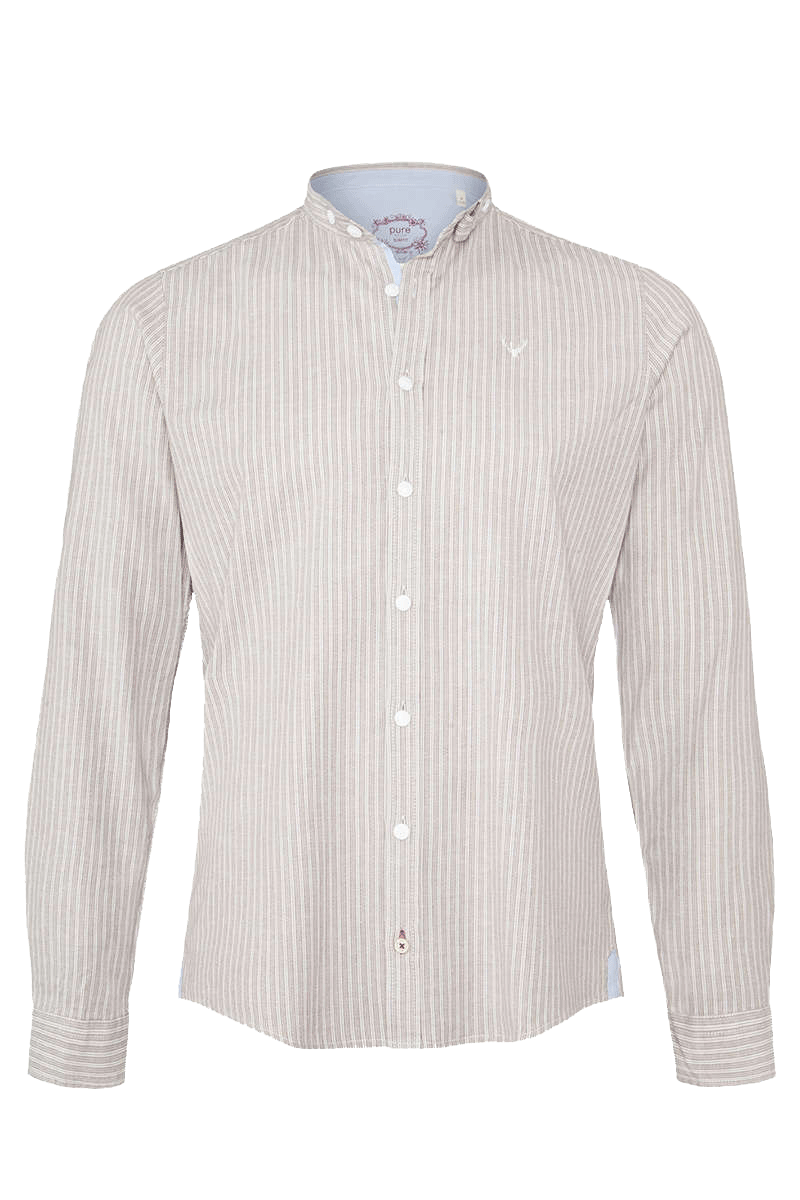 Ein edles Trachtenhemd von pure, das mit den nostalgischen Knöpfen und dem hellbraunen Streifenmuster einen unverwechselbaren Vintage-Look ausstrahlt. Dieser wird noch durch den Stehkragen mit der knöpfbaren Lasche verstärkt. Das Slim-Fit-Design und die Beimischung von Elasthan zur Baumwolle sorgen für einen körpernahen Sitz.