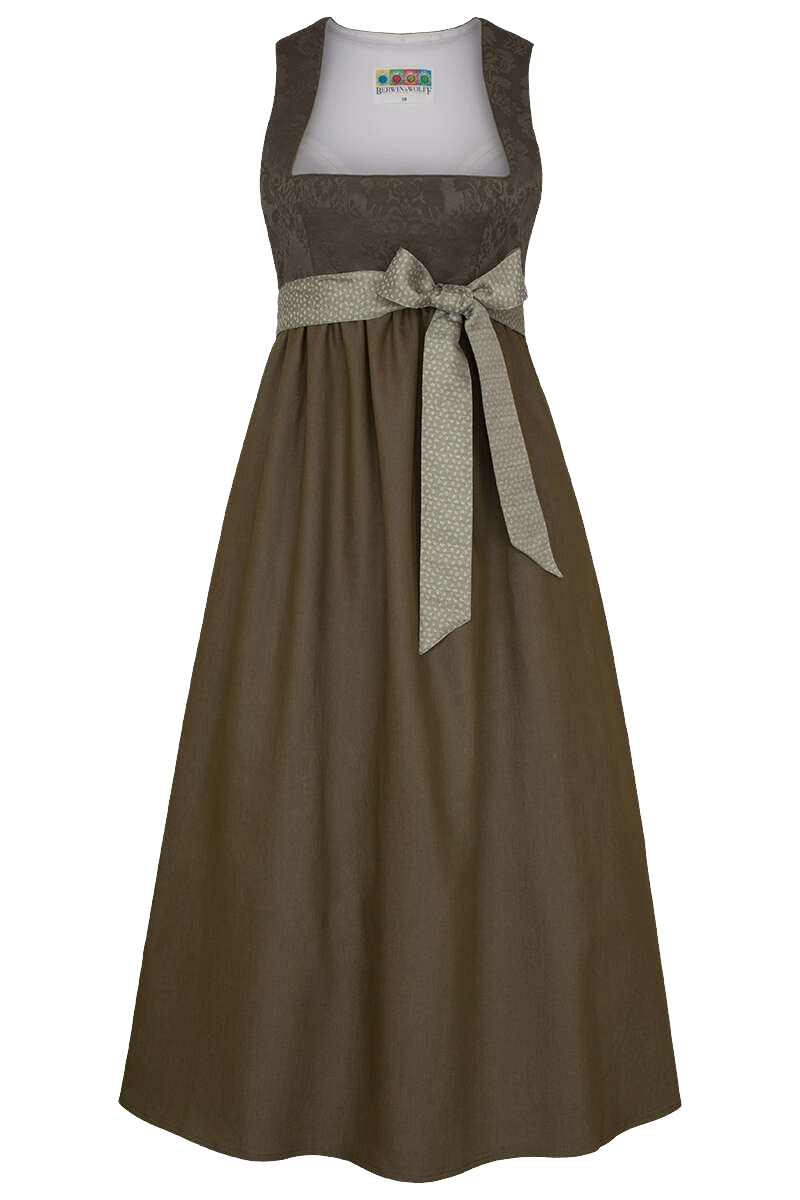 Dieses elegante, olivfarbene Umstandsdirndl von Berwin für werdende Mamas bietet Ihrem wachsenden Babybauch in der Schwangerschaft genügend Platz.Das Kleid besitzt einen verdeckten seitlichen Reißverschluss und ein schönes gerades Dekolleté. Das Oberteil ist aus Brokatstoff mit einem edlen floralem Muster gefertigt. Anstelle einer konventionellen Schürze ziert ein niedliches Band mit Blümchenmuster die Körpermitte, welches zur Schleife gebunden wird und den Babybauch wunderschön zur Geltung bringt.Der Rock aus weichem, fließendem Stoff hat eine Länge von circa 85 cm in Größe 36.Die Dirndlbluse India 1043500 ist die genau passende Dirndlbluse zum Dirndl. Es passen jedoch auch viele andere Dirndlblusen zu unseren Umstanddirndln.