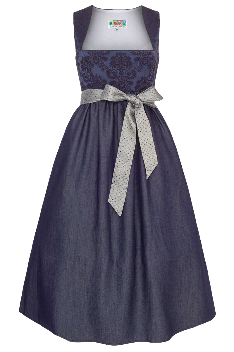Dieses elegante, dunkelblaue Umstandsdirndl von Berwin für werdende Mamas bietet Ihrem wachsenden Babybauch in der Schwangerschaft genügend Platz.Das Kleid besitzt einen verdeckten seitlichen Reißverschluss und ein schönes gerades Dekolleté. Das Oberteil ist aus Brokatstoff mit einem edlen floralem Muster gefertigt. Anstelle einer konventionellen Schürze ziert ein niedliches Band mit Blümchenmuster die Körpermitte, welches zur Schleife gebunden wird und den Babybauch wunderschön zur Geltung bringt.Der Rock aus weichem, fließendem Stoff hat eine Länge von circa 85 cm in Größe 36.Die Dirndlbluse India 1043500 ist die genau passende Dirndlbluse zum Dirndl. Es passen jedoch auch viele andere Dirndlblusen zu unseren Umstanddirndln.