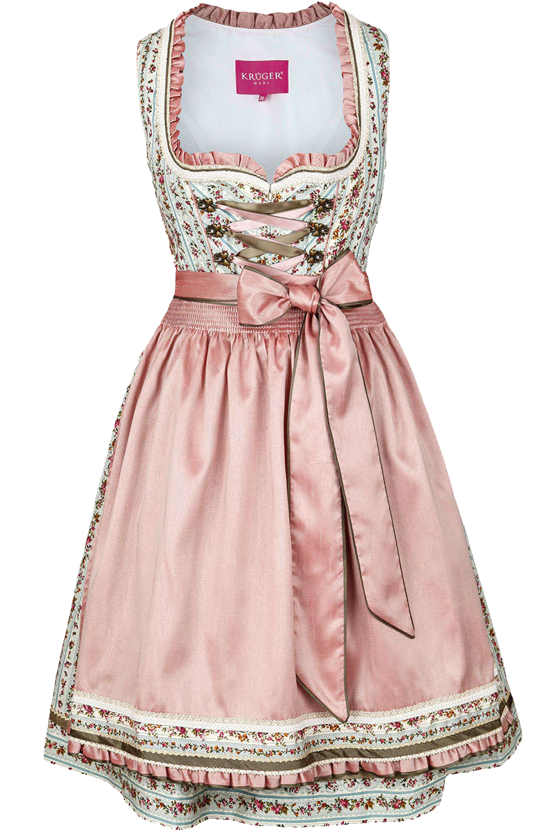 Dieses Vintage-Dirndl der Marke Krüger Madl hat viele liebevolle Details. Das Oberteil und der Rock des Dirndls sind aus einem türkis gehaltenem Stoff in Streifenmanier mit angedeutetem Spitzendruck und romantischem Blumenmuster. Das Dirndl wird mit einem Reißverschluss vorne am Mieder geschlossen.Die Gesamtlänge des Dirndl beträgt von der Schulternaht bis zum Rocksaum 106 cm.Oberteil:Rund um den herzförmigen Balkonett-Ausschnitt verläuft eine rosé-farbene Rüschenbordüre. Zudem sind dort eine weitere oliv-farbene Zierpaspel, eine weiße Borte und eine creme-farbene Spitzenbordüre angebracht. Die Abnäher am Oberteil sind mit rosé-farbenen Zierpaspeln versehen. Die Zierschnürung besteht aus einem weißen und einem oliv-farbenen Band die in aufwendig gearbeiteten Miederhaken mit Strass-Stein verlaufen.Rock:In den Rock sind rechts und links zweiTaschen eingearbeitet. Am Saum des Rockes sind eine weitere oliv-farbene Zierbordüre und eine goldene Litze angebracht. Die Rocklänge bei Konfektionsgröße 36 beträgt ca. 62 cm.Schürze:Zu dem Dirndl gehört eine Schürze aus matt glänzendem Stoff. Die Schürze ist am Saum mit einer Vielzahl von Zierstreifen und einem Volant versehen.