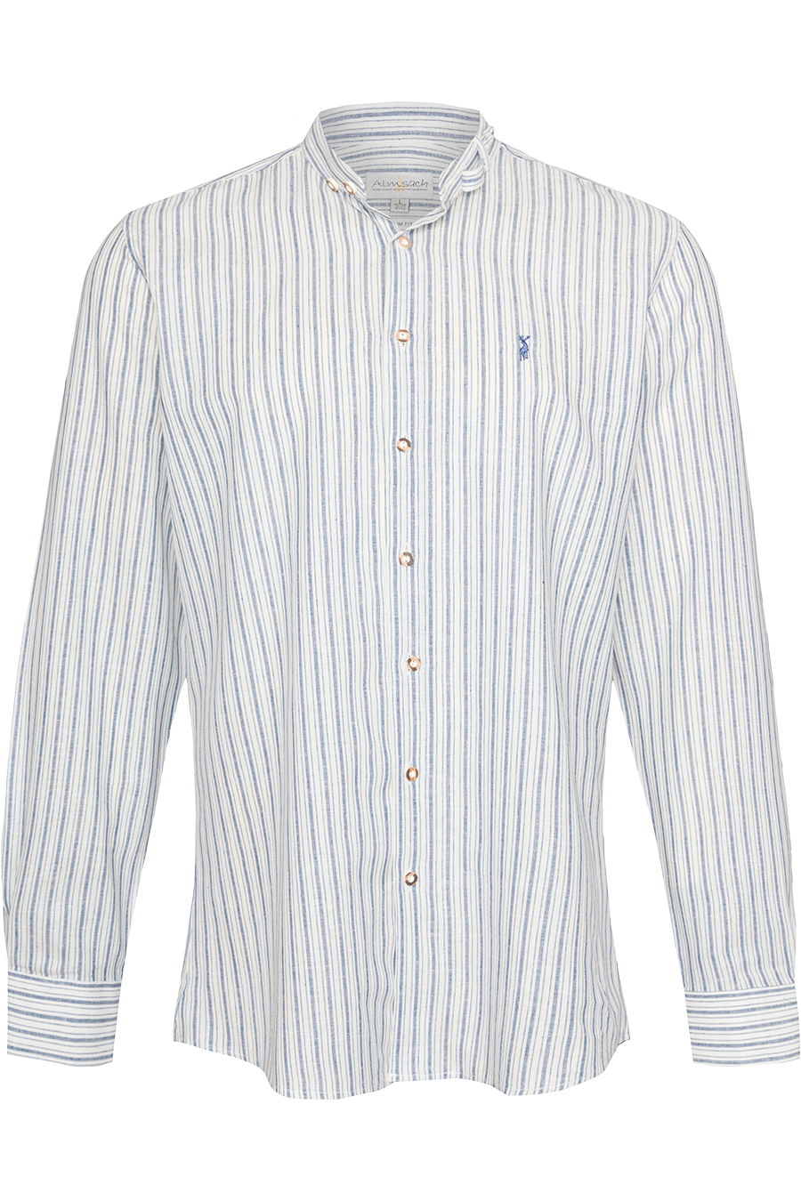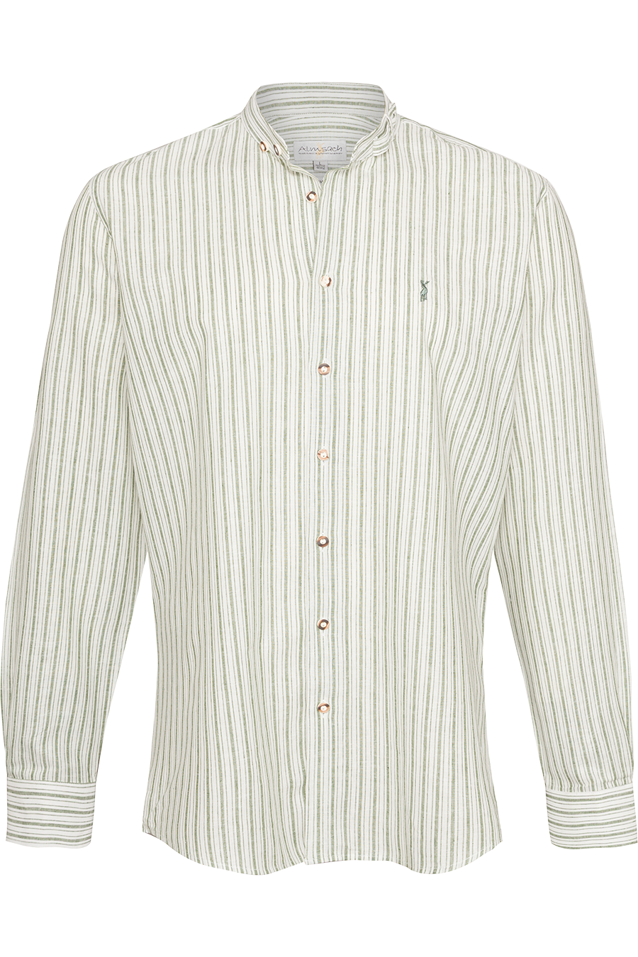 Das feine Streifendesign verleiht dem Hemd eine klassische Optik. Der hochgeschlossene Stehkragen mit schmalem Riegelverschluss unterstreicht den traditionellen Charakter, während die Knöpfe in Hirschhornoptik stilvolle Akzente setzen.