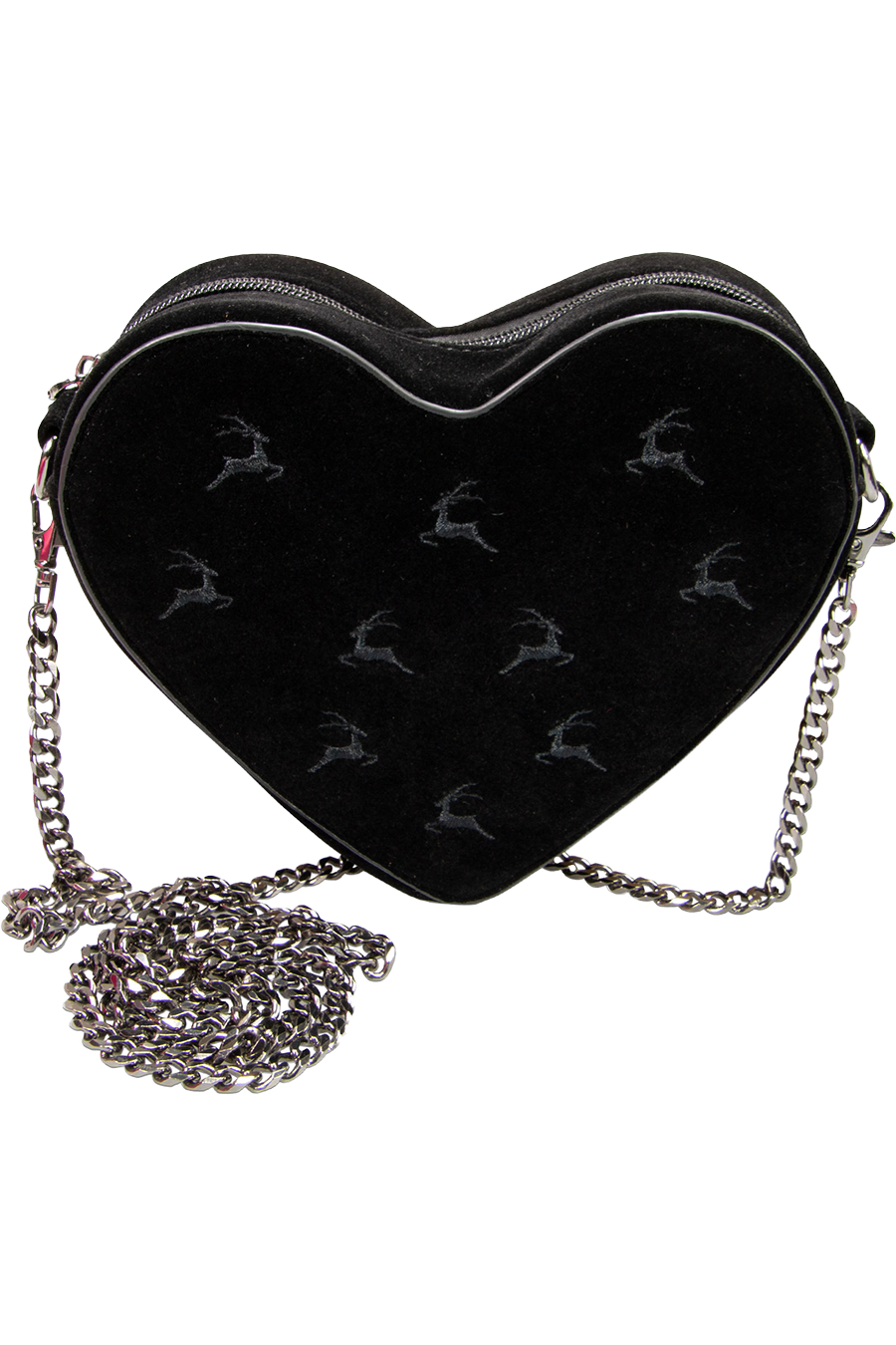 Diese herzförmige Trachten-Tasche aus weichem Samt vereint Tradition und Stil auf charmante Weise. Mit edler Hirsch-Stickerei verziert, ist sie das perfekte Accessoire zum Dirndl oder für festliche Trachtenoutfits.