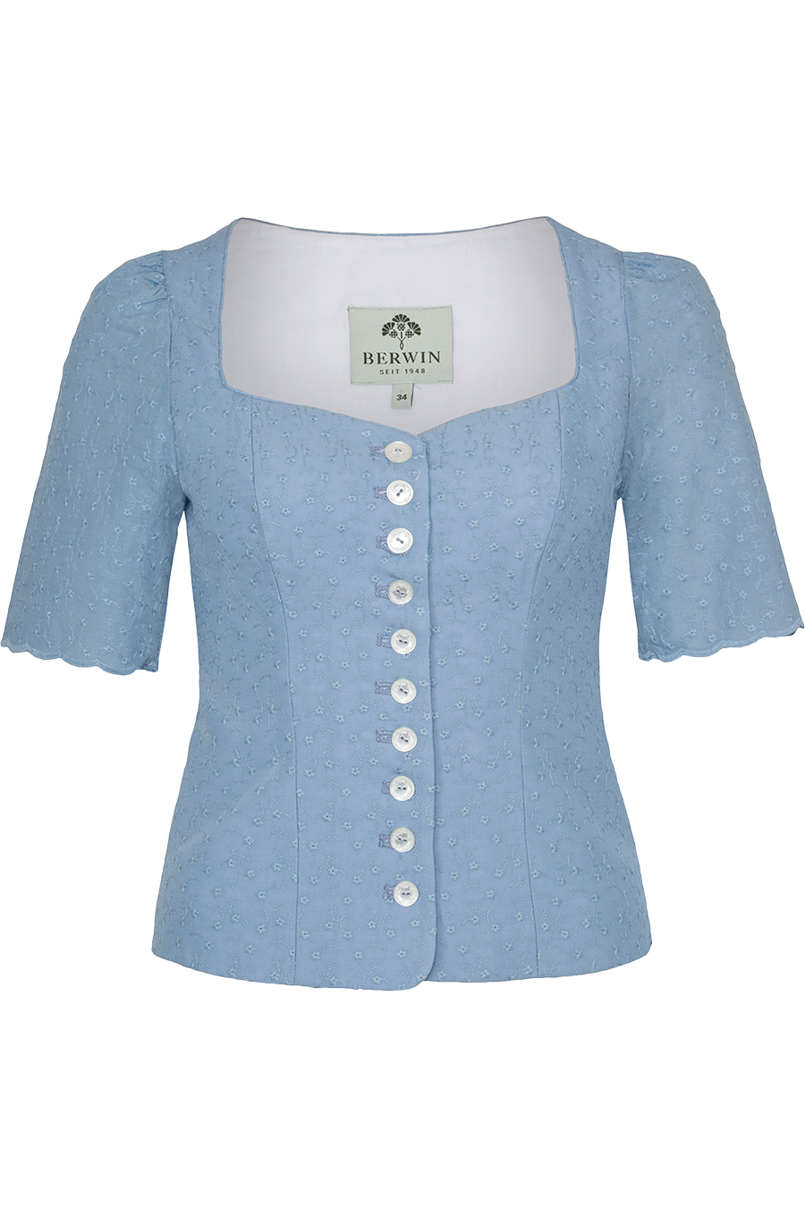Besonderes Detail: Die perlmuttfarbenen Knöpfe sind aufwendig mit einem filigranen Blumenmuster verziert. Auf der Rückseite rundet ein traditionelles Schößchen den Look stilvoll ab.