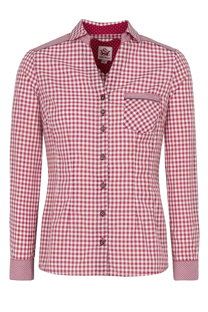 Produktinformationen:Diese süße, rot-weiß karierte Bluse der Marke Spieth & Wensky verfügt über ein paar niedliche Details. Die langen Ärmel sind am Abschluss mit Knöpfen in Hirschhornoptik versehen. Die Knopfleiste ist ebenfalls mit Knöpfen in Hirschhornoptik versehen. Die Ärmelmanschetten, der Abschluss der Brusttasche, sowie Applikationen auf dem Schultersattel und ein Teil des Kragens sind aus kleinkariertem, rot-weißen Stoff gearbeitet. Auf der Brusttasche ist das Karomuster gedreht. Im Rücken auf der Innenseite ist ein Herz mit dem Etikett angebracht. Dieses Herz ist als rote Stickerei auf der Rückseite sichtbar. Die Ärmel können hochgekrempelt werden und mittels zwei Knöpfen in Hirschhornoptik befestigt werden. In den Seitennähten der Bluse ist jeweils eine Kordel eingearbeitet mit der die Bluse leicht gerafft werden kann. Schnitt:Die Abnäher der Bluse garantieren einen taillierten Sitz. Die Bluse ist mit einem klassischen Kragen ausgestattet. Zudem verfügt die Bluse über eine Brusttasche.