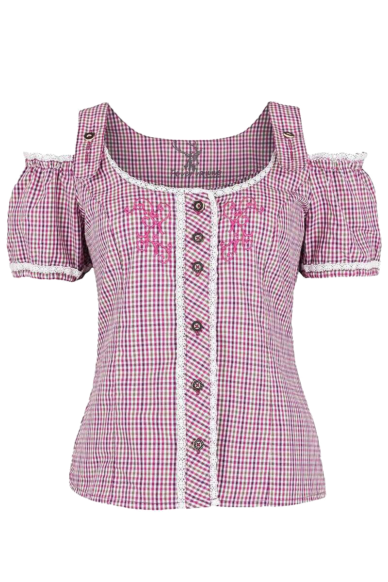 Produktinformationen:Diese süße, taillierte Bluse im Carmenstil ist in beere-weiß kariert gehalten. Die Bluse verfügt über eine Spitzenbordüre am vorderen Teil des Ausschnitts und an den Ärmelausschnitten. Auf der Knopfleiste ist das Karomuster gedreht. Links und rechts der Knopfleiste und an den Ärmeln sind weiße Spitzenbordüren angebracht. Zudem sind links und rechts der Knopfleiste beere-farbene, florale Muster eingestickt. Die Knöpfe der Bluse sind in Hirschhornoptik gehalten. Hinten verfügt die Bluse über eine Zierschnürung.Was macht diese Bluse zu Ihrer Lieblingstracht?Diese süße Baumwoll-Bluse ist nicht nur pflegeleicht sondern auch äußerst angenehm zu tragen. Die liebevollen Details machen die Bluse zu einem absoluten Hingucker.Diese Lieblingsstücke lassen sich hierzu perfekt kombinieren:Zu dieser Bluse empfehlen wir Ihnen eine trachtige Jeans im Lederhosenlook oder einen feschen Trachtenrock. Ein traditionelles Kropfband und ein Strickjanker können hierzu ebenfalls gut kombiniert werden. Zu diesen Anlässen können Sie diese Tracht perfekt tragen:Diese Bluse können Sie sowohl im Alltag als auch zu Trachtenfesten tragen