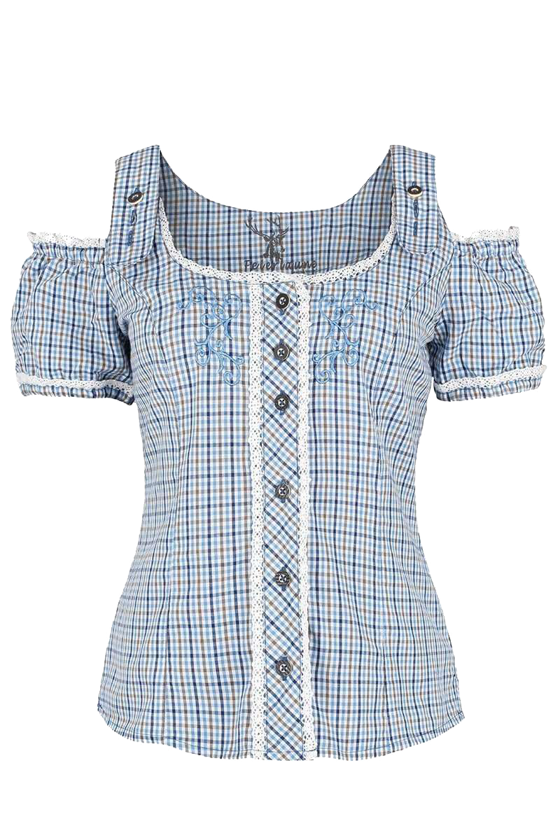 Produktinformationen:Diese süße, taillierte Bluse im Carmenstil ist in blau-weiß kariert gehalten. Die Bluse verfügt über eine Spitzenbordüre am vorderen Teil des Ausschnitts und an den Ärmelausschnitten. Auf der Knopfleiste ist das Karomuster gedreht. Links und rechts der Knopfleiste und an den Ärmeln sind weiße Spitzenbordüren angebracht. Zudem sind links und rechts der Knopfleiste blaue, florale Muster eingestickt. Die Knöpfe der Bluse sind in Hirschhornoptik gehalten. Hinten verfügt die Bluse über eine Zierschnürung.Was macht diese Bluse zu Ihrer Lieblingstracht?Diese süße Baumwoll-Bluse ist nicht nur pflegeleicht sondern auch äußerst angenehm zu tragen. Die liebevollen Details machen die Bluse zu einem absoluten Hingucker.Diese Lieblingsstücke lassen sich hierzu perfekt kombinieren:Zu dieser Bluse empfehlen wir Ihnen eine trachtige Jeans im Lederhosenlook oder einen feschen Trachtenrock. Ein traditionelles Kropfband und ein Strickjanker können hierzu ebenfalls gut kombiniert werden. Zu diesen Anlässen können Sie diese Tracht perfekt tragen:Diese Bluse können Sie sowohl im Alltag als auch zu Trachtenfesten tragen.