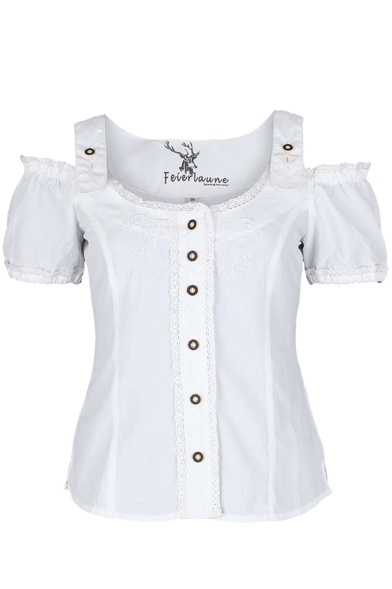 Produktinformationen:Diese süße, taillierte Bluse im Carmenstil ist in Weiß gehalten. Die Bluse verfügt über eine Spitzenbordüre am vorderen Teil des Ausschnitts und an den Ärmelausschnitten. Links und rechts der Knopfleiste und an den Ärmeln sind weiße Spitzenbordüren angebracht. Zudem sind links und rechts der Knopfleiste weiße, florale Muster eingestickt. Die Knöpfe der Bluse sind in Hirschhornoptik gehalten. Hinten verfügt die Bluse über eine Zierschnürung.