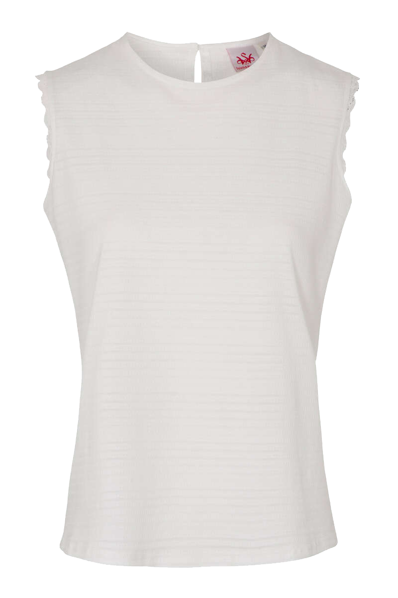 TIRA von Spieth & Wensky ist eine weiße, ärmellose Bluse mit feiner Lochmusterung. Das weiche Material mit hohem Baumwollanteil verspricht ein angenehmes Tragegefühl.Der hochgeschlossene Rundhalsausschnitt und die zarten Strukturstreifen machen das Design zeitlos und modern, wodurch sich die Bluse wunderbar kombinieren lässt. Die feinen Spitzendetails und der figurbetonte Schnitt des Oberteils sorgen für einen femininen Look.Die Bluse wird hinten mit einem Knopf geschlossen.In der Größe 32 beträgt die Rückenlänge ca. 54 cm.