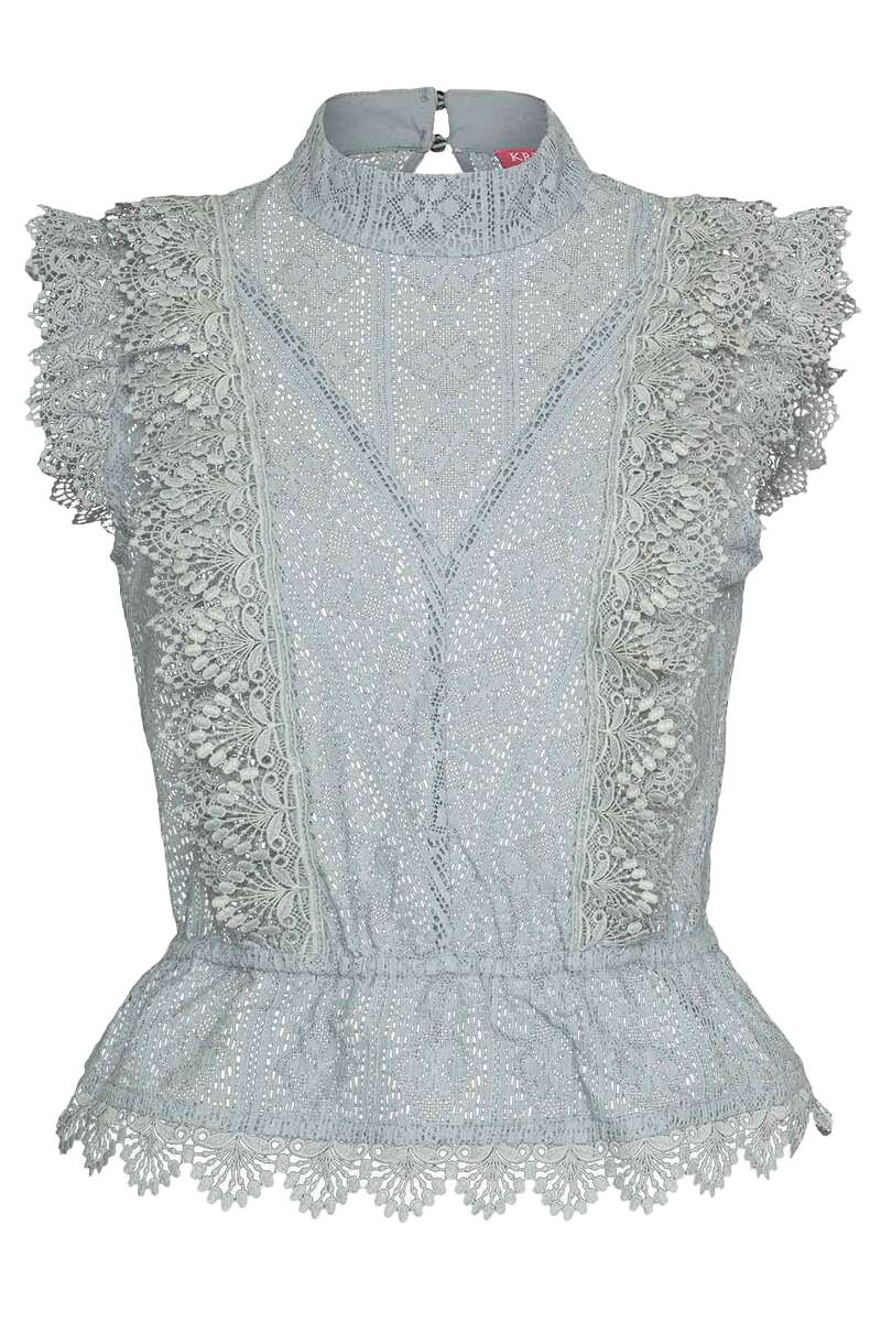 Die wunderschöne ärmellose Trachtenbluse in der Farbe Grau ist ein echter Hingucker. Sie lässt sich hervorragend zum Trachtenrock oder zur Lederhose kombinieren. Aber auch im Alltag kann die Bluse perfekt zu Jeans getragen werden. Die Bluse besteht aus einer hübschen, leicht transparenten Spitze. Der Ausschnitt ist modern hochgeschlossen. Die Spitzenborte läuft V-förmig zu den Ärmelenden. Diese sind ebenfalls mit einer weiteren Borte in Flügelform versehen. Der Gummizug in der Taille sorgt für einen figurbetonten Schnitt und betont die Spitzenborte am Saum. Das Material besteht aus 80% Baumwolle und 20% Elasthan und ist daher sehr angenehm zu tragen und formbeständig.
