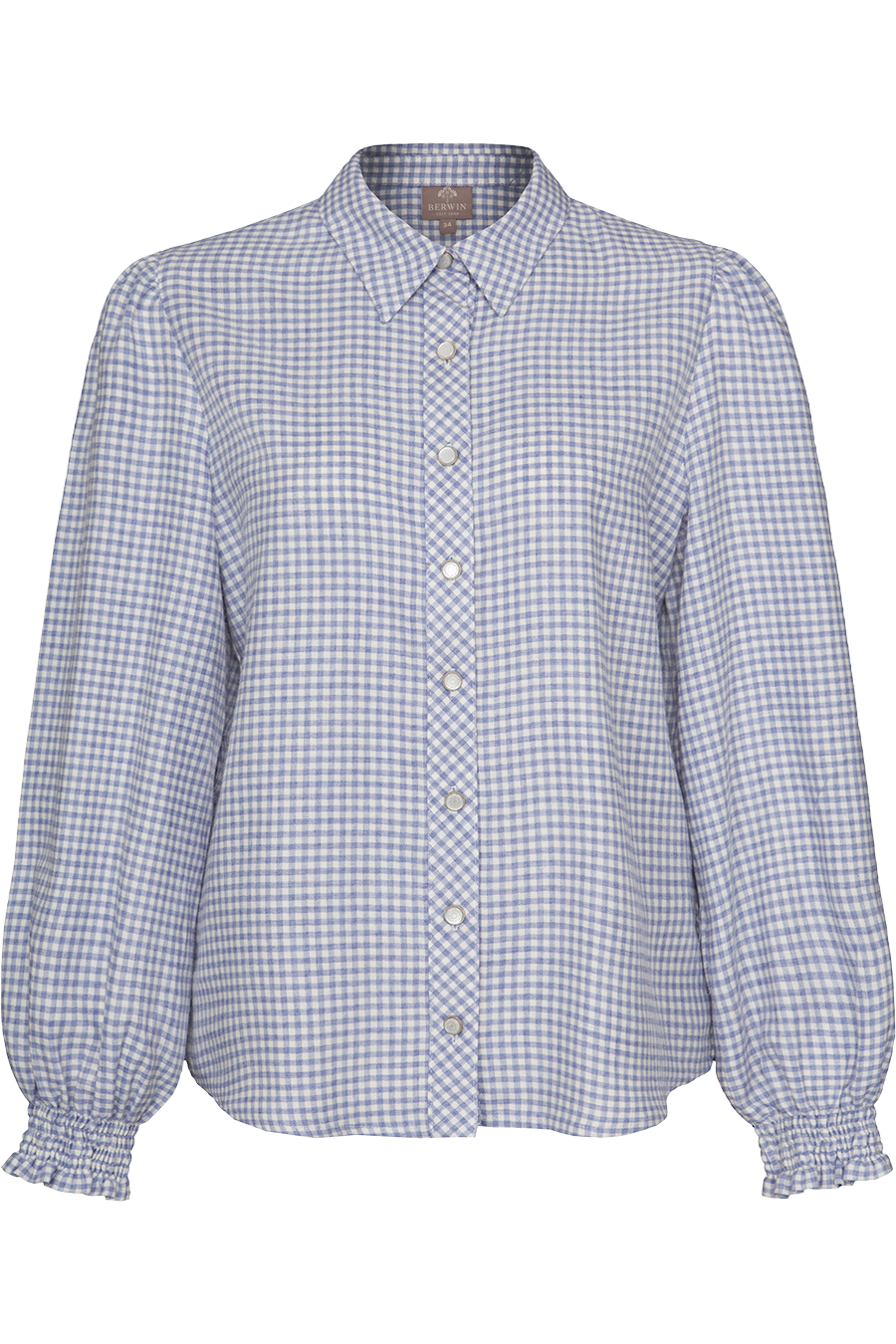 Das feine Karomuster und die dekorativen Knöpfe unterstreichen den Trachtencharakter, während der klassische Umlegekragen dem Modell eine zeitlose Note verleiht. Die weiten Ärmel mit breiten Gummibündchen und feinen Rüschen sorgen für einen femininen Akzent. Ein leicht abgerundeter Saum ergänzt den legeren Schnitt perfekt.