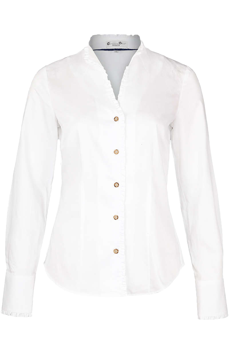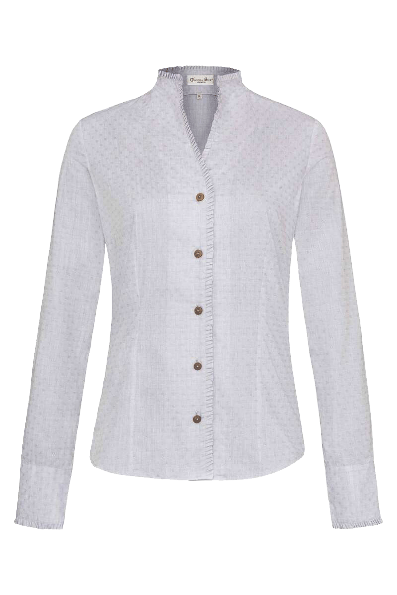 Valentina ist eine Trachtenbluse aus feinster Baumwolle in Premiumqualität. Die klein gearbeitete Rüsche an Stehkragen, Knopfleiste und den langen, ausgestellten Manschetten gibt der Bluse einen romantischen Auftritt. Der Halsausschnitt ist in V-Form gehalten.
