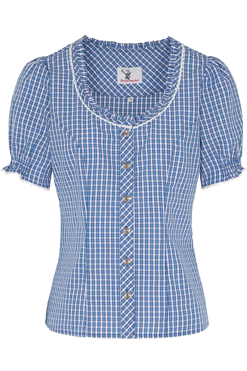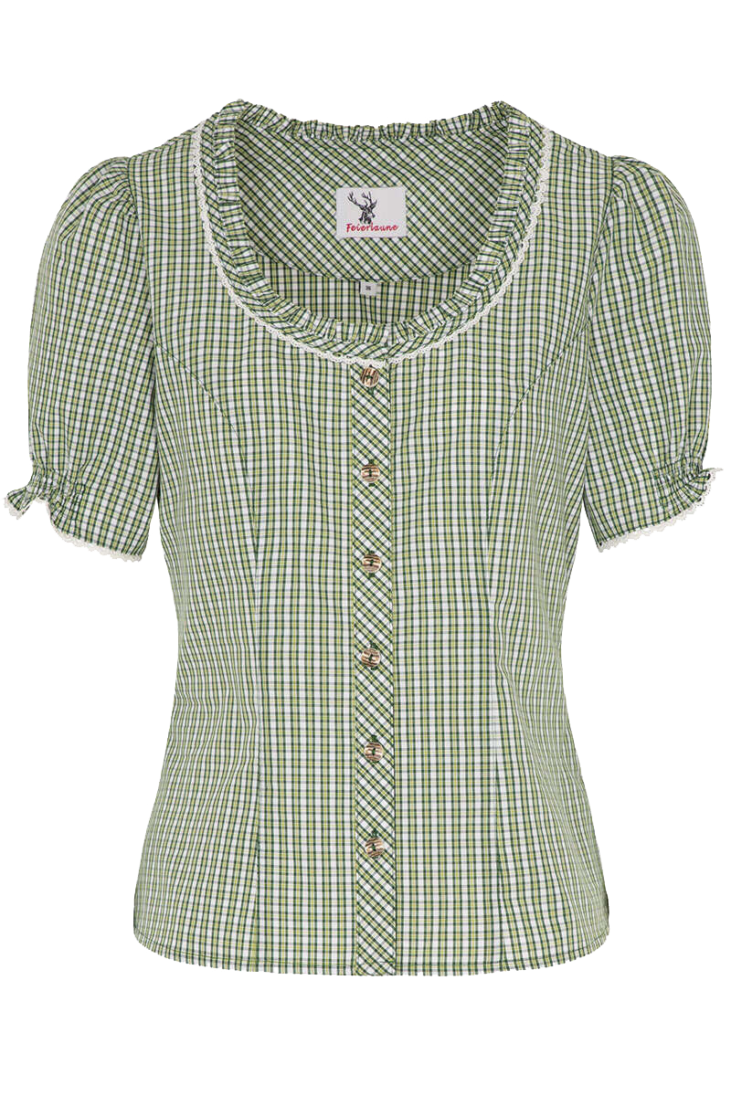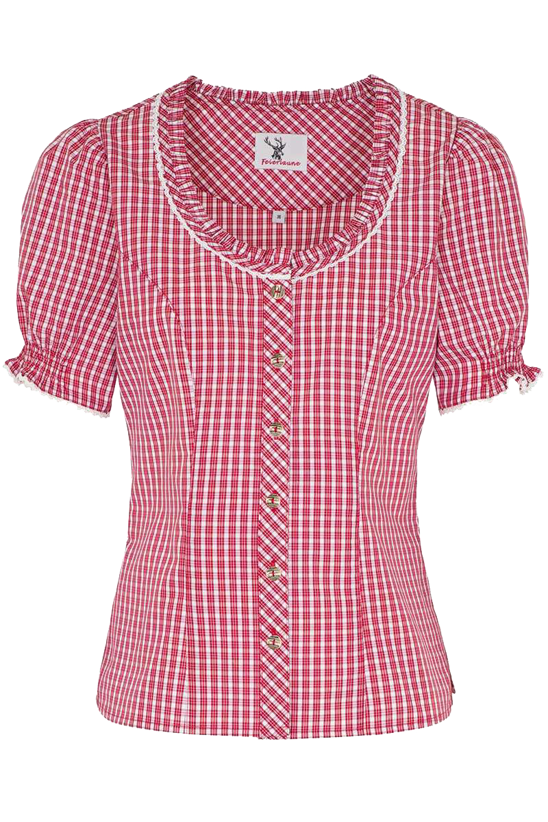 Die liebliche kurzärmlige Trachtenbluse NEUMÜHL der Firma Spieth&Wensky verfügt über ettliche kleine Details. Der Rundhalsausschnitt ist mit Rüschen und einer schmalen weißen Bordüre umrandet. Die Ärmel sind an der Schulter und am Abschluss leicht gerafft und mit einer weißen Spitze umrandet. Die Knopfleiste ist mit Knöpfen in Hirschhornoptik versehen und das Karomuster ist auf der Knopfleiste gedreht. Auch in den großen Größen ist die Bluse sehr auf Taille geschnitten!