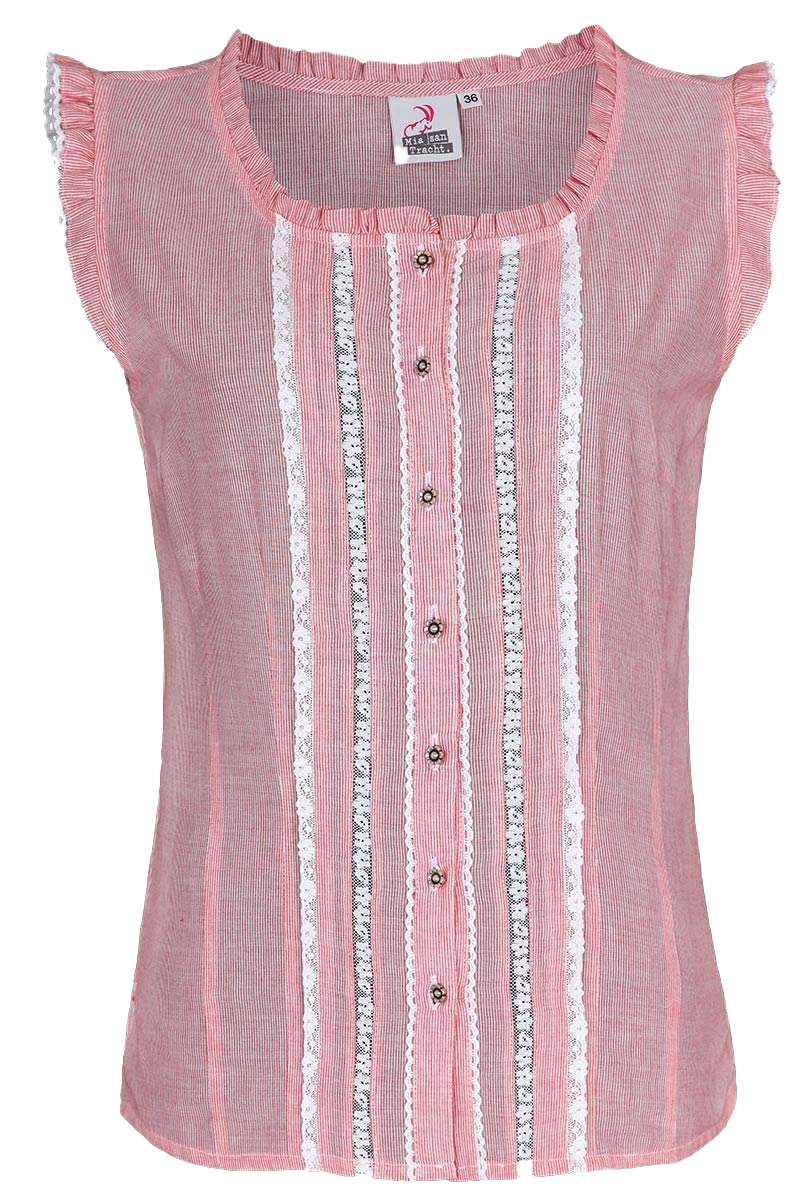 Die ärmellose Bluse vonMia san Tracht mit zartem rot/weißem Streifenmuster besitzt einen weit ausgeschnittenen Rundkragen, der mit einer Borte eingefasst ist. Die Knopfleiste ist mit schmalen weißen Spitzen gesäumt. Die Knöpfe aus Metall haben die Form von kleinen Rosen. Ein kleiner Spitzenbesatz sowie eine Borte umrahmen den Armausschnitt.