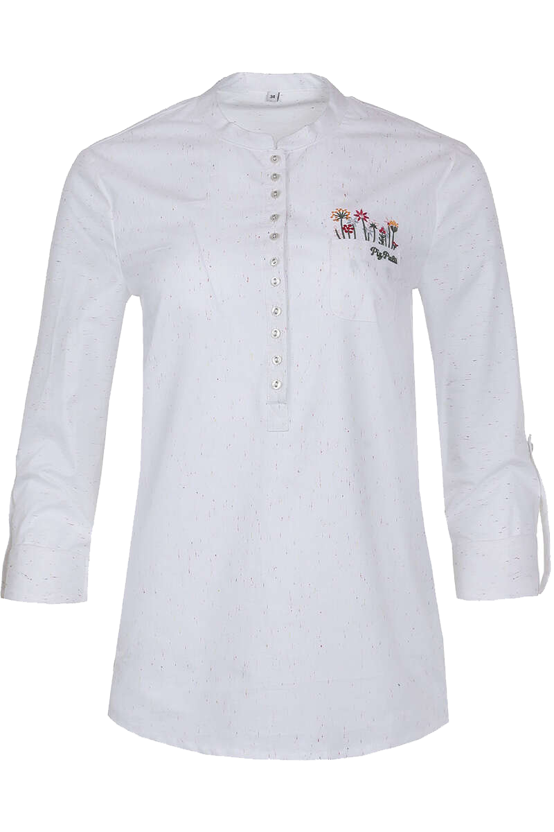 Die natürliche, moderne Damenbluse BALZHAUSEN von Piz Palü besitzt eine weiße Grundfarbe (edelweiss) und ist mit winzigen bunten Farbtupfen besprenkelt, was der Bluse aus Baumwoll-Leinen-Gemisch ihren einzigartigen Look verleiht. Eine kleine Tasche, aufgestickte farbenfrohe Wiesenblumen und der Schriftzug Piz Palü zieren die Vorderseite auf Brusthöhe. Der runde Halsausschnitt besitzt einen schmalen Stehkragen, darunter schliesst eine Knopfleiste an, die ungefähr bis zur Mitte des Oberkörpers verläuft. Die glatten Ärmel sind dreiviertel-lang und geschlitzt. Sie können hoch gekrempelt und mit Hilfe eines knöpfbaren Riegels befestigt werden.Die Bluse ist eher lang geschnitten, der abgerundete Saum unterstreicht zusätzlich den legeren Auftritt.