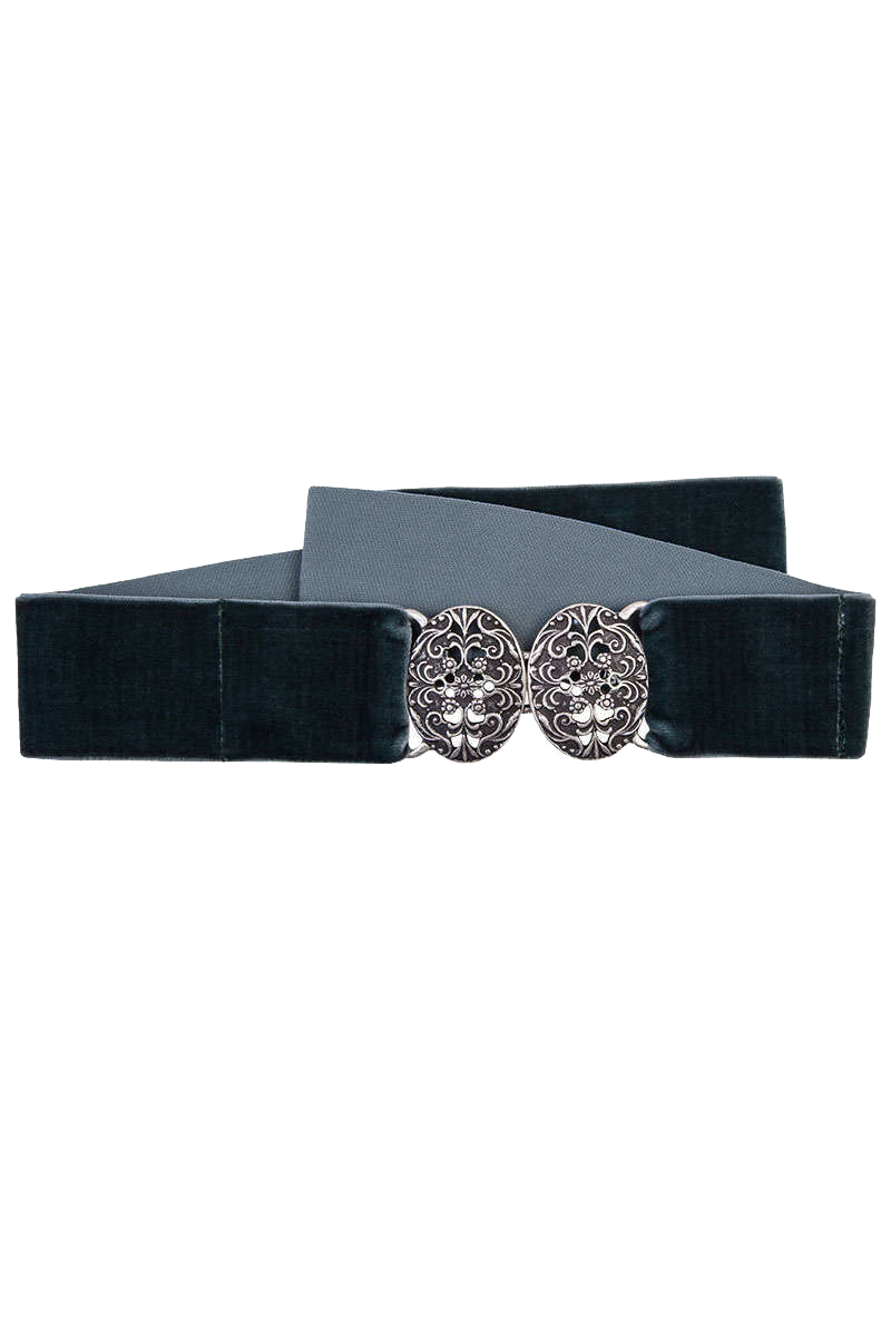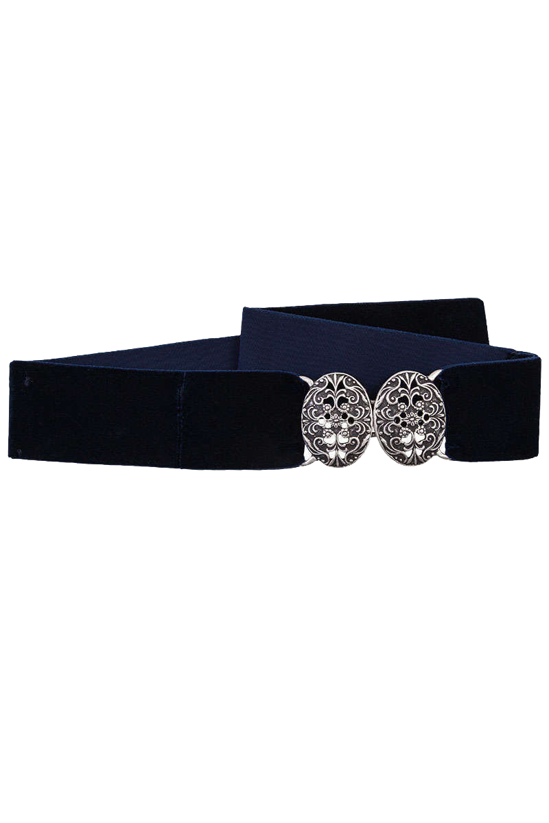 Ein eleganter Trachtengürtel in Nachtblau aus Samt-Stretch. Der Gürtel ist ca. 3,8 cm breit. Geschlossen wird er mit einer hübschen Metallschließe in Altsilber. Das dehnbare Gewebe verleiht ihm einen hohen Tragekomfort.