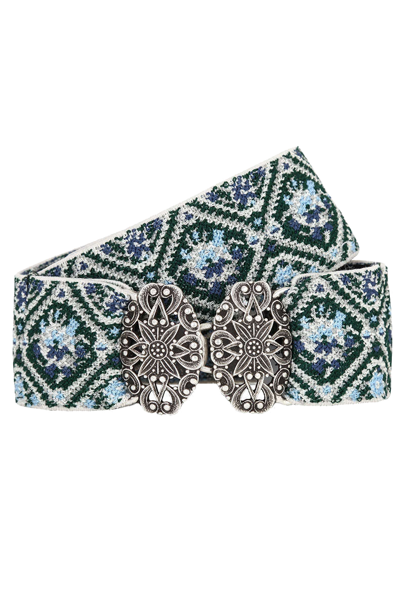 Dieser Gürtel aus elastischem Gewebe mit Brokatmuster wird mit einer silberfarbenen, fein ziselierten Metallschließe geschlossen, der perfekt zu jedem Dirndl oder Rock kombiniert werden kann. Wird er beispielsweise zu einer Jeans getragen, verleiht er dem Outfit der Trägerin einen dezenten Trachten-Touch.