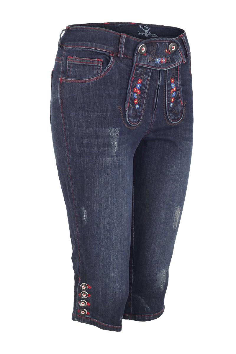 Modische, freche und auffallende Jeans in Kniebundlänge. Diese süße und sehr freche Jeans in Lederhosenoptik ist der absolute Hingucker. Sie ist ausgestattet mit einem Latz mit bunten, sehr aufwendigen Stickereien und zwei Hirschhornknöpfen, sowie einem Reißverschluss. Die Hose ist im Five-Pocket-Stil designt und verfügt somit über zwei normale und eine kleine Einschubtasche vorne und zwei weiteren Einschubtasche hinten. Die Nähte der Hose sind allesamt in Rot gehalten. An den Beinabschlüssen sind vier Knöpfe in Hirschhornoptik angebracht.Kombinieren Sie diese fesche Hose doch mit unseren Trachtenchucks und einem trachtigen Shirt oder einen karierten Bluse.