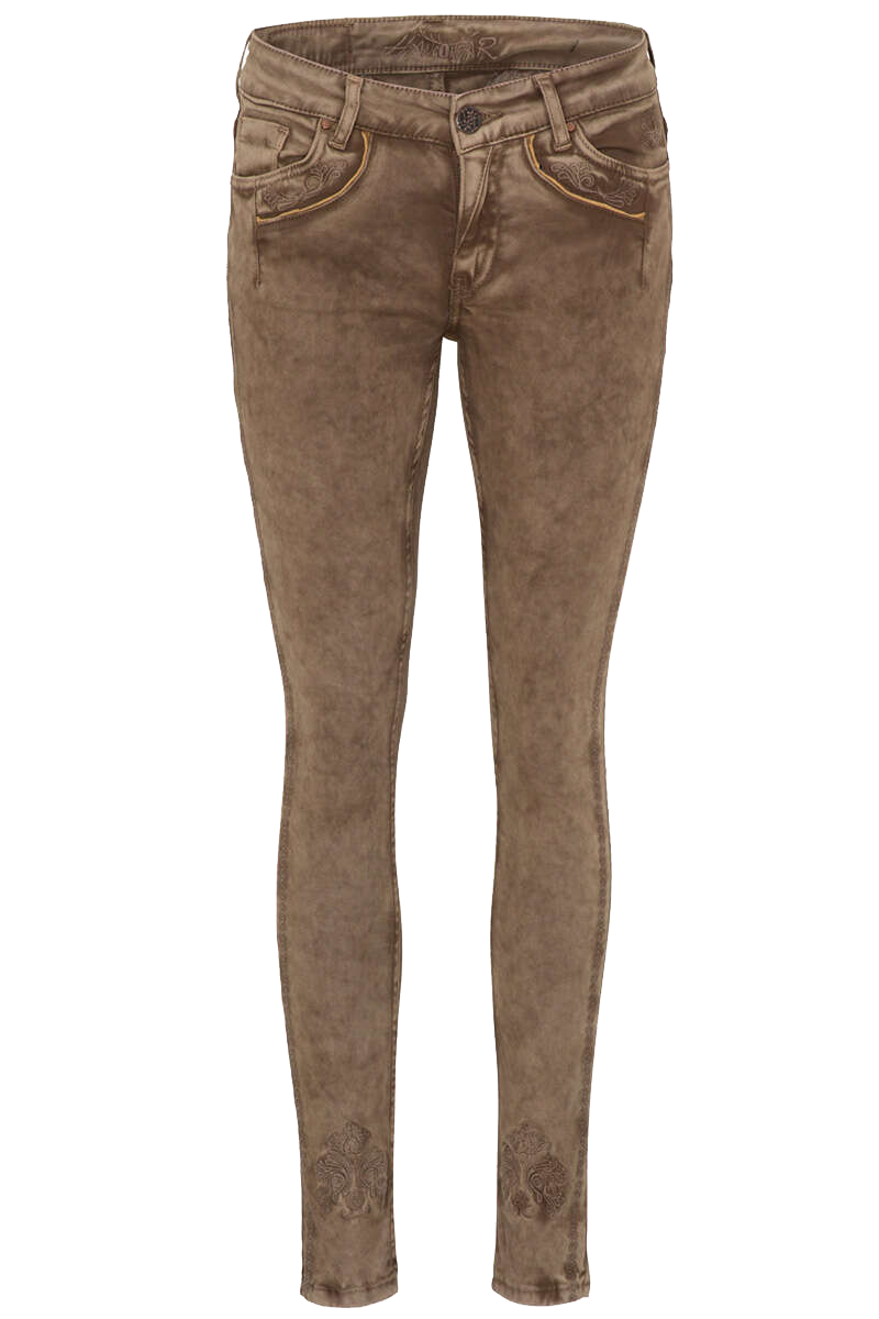 Die modische und freche Damen-Stretch-Jeans in schlamm (braun) ist im Five-Pocket-Stil designt und verfügt somit über zwei normale und eine kleine Einschubtaschen vorne und zwei weitere Einschubtaschen hinten. Die vorderen Taschen der anliegenden Röhrenjeans zieren dezente farbgleiche Stickereien.Ein besonderes Highlight: Die äußeren Seitennähte besitzen durchgehend von oben bis zum Beinabschluss einen dezenten gestickten Zierstreifen. Auch die Beinabschlüsse sind vorne mit einer zurückhaltenden Trachtenstickerei verziert. Ein wunderschöner Metallknopf in Kupferoptik zum Schließen der Hose sowie zwei Ziernieten der selben Farbe am Bund machen den lässigen Trachtenstyle perfekt.Aus angenehm zu tragender Baumwolle mit Elasthananteil.Kombinieren Sie diese fesche Hose doch mit unseren Trachtenchucks und einem trachtigen Shirt oder einen karierten Bluse.