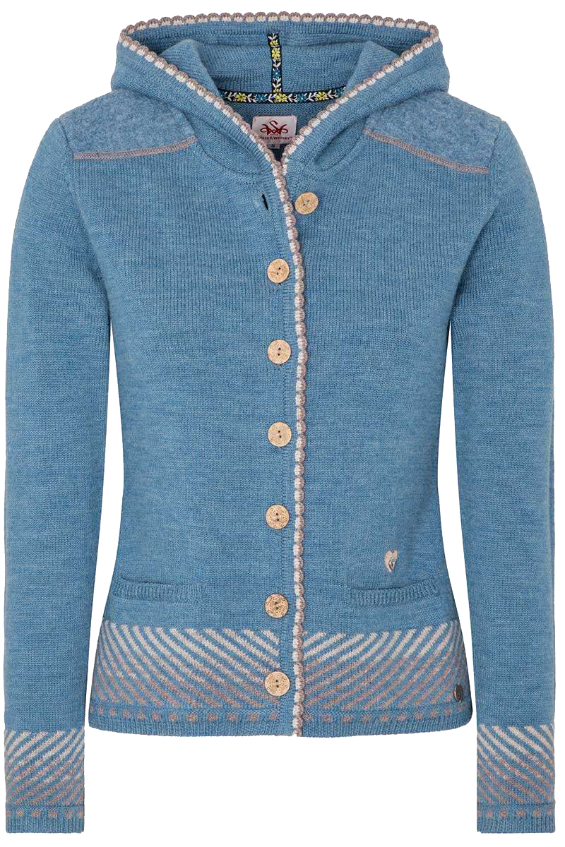 WINKA von Spieth&Wensky ist eine hübsche hellblaue Damen-Strickjacke mit Kapuze, Taschen und vielen verspielten Details.Zum ruhigen Rechtsstrick der Jacke bildet der beige Zierrand in gestrickten 'Mäusezähnchen' an der Knopfleiste und um die Kapuze einen wunderschönen Kontrast. Armsäume und Bund ziert ein schräges Streifenmuster in Beigetönen.Schulter- und Ellenbogenaufsätze sind dem angesagten Materialmix entsprechend aus hellblauem Walk gefertigt.Das kleine gestickte Herz in beige mit Metallanhänger über der linken Tasche ist ein Beispiel für die vielen verspielten Details. Schön verzierte Holzknöpfe machen den schicken Alpenlook der vielseitigen Jacke perfekt. Der Schnitt ist leicht tailliert.