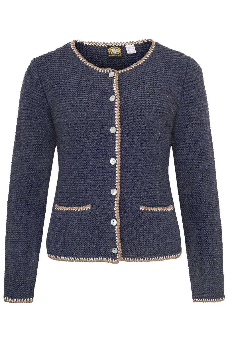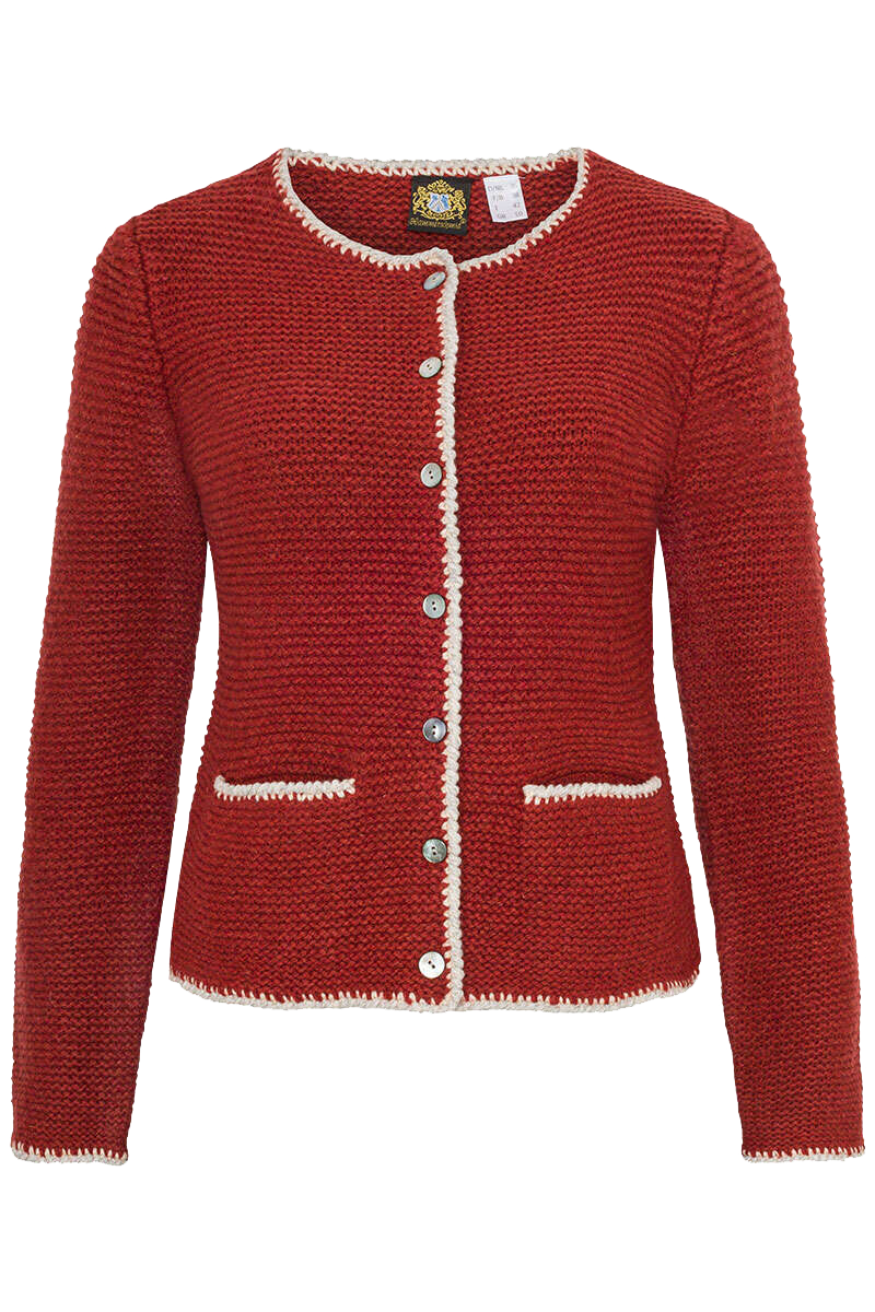 TYROL von Hammerschmid ist ein schöner rostroter Damen-Trachtenjanker in klassischem Linksstrick. Die Ränder am Bund, der Knopfleiste und den beiden vorderen Einschubtaschen setzen sich raffiniert farblich ab, durch eine Einfassung mit so genannten Mäusezähnchen in naturweiss. Geschlossen wird die Jacke mit edlen Perlmutknöpfen.