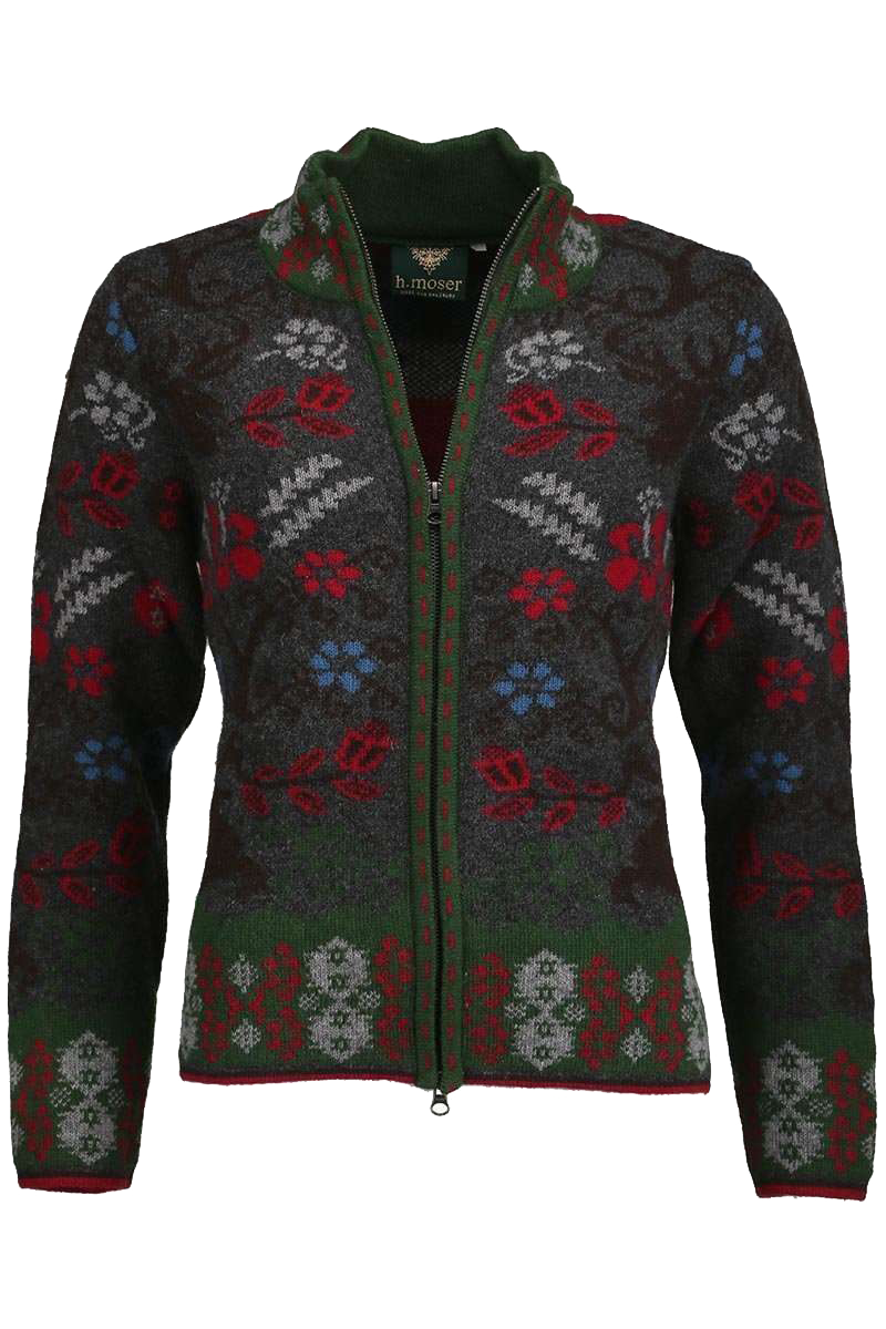 Diese kuschelige und sehr warme Strickjacke ist über und über mit trachtigen und modernen Motiven geziert. Der hohe Kragen, die Ärmel- und die Saumabschlüsse sind in dunkelgrün gehalten und mit grauen und roten Mustern verziert. Der Rest der Jacke ist in Anthrazot gehalten. Auf der Jacke sind springende Hirsche, Hirschköpfe, Zweige mit Blumen daran und Rosen, aber auch Hawaiiblumen abgebildet. Die Hawaiiblumen bilden einen tollen Kontrast zu den sonst eher klassischen Motiven der Jacke. Geschlossen wird die Jacke mit einem Reißverschluss.