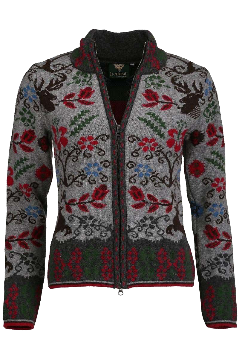 Diese kuschelige und sehr warme Strickjacke ist über und über mit trachtigen und modernen Motiven geziert. Der hohe Kragen, die Ärmel- und die Saumabschlüsse sind in dunkelgrau gehalten und mit grünen und roten Mustern verziert. Der Rest der Jacke ist in Hellgrau gehalten. Auf der Jacke sind springende Hirsche, Hirschköpfe, Zweige mit Blumen daran und Rosen, aber auch Hawaiiblumen abgebildet. Die Hawaiiblumen bilden einen tollen Kontrast zu den sonst eher klassischen Motiven der Jacke. Geschlossen wird die Jacke mit einem Reißverschluss.