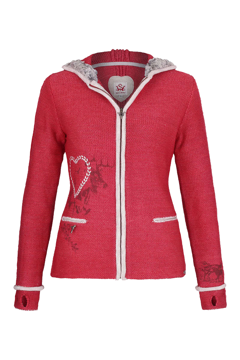 Diese süße Strickjacke mit Kapuze ist der absolute Hingucker. Die Jacke ist in Linksstrick gearbeitet und mit ein paar Zopfmustern versehen. Die Abschlüsse der Kapuze und des Reißverschluss sind mit einem Streifen in Wollweiß gearbeitet. Zudem ist in der Kapuze ein Streifen aus grauem Fellimitat angebracht. Auch an den Ärmel ist ein Streifen in Wollweiß angebracht. Die Abschlüsse der Ärmel und der Einschubtaschen sind ebenfalls mit einer Ziernaht in Wollweiß versehen. Auf der rechten Vorderseite der Jacke ist ein großes Herz in Wollweiß eingestickt. Zudem ist dort ein dezenter Print mit zwei Hirschen und einem Greifvogel angebracht Auch unterhalb der rechten Einschubtasche ist ein weitere Print angebracht. Dort befindet sich auch ein kleiner Hirschkopf aus Metall. Im Rücken der Jacke auf der rechten Seite ist noch ein Print angebracht. Dieser zeigt einen Hirsch und einen großen Baum. Die Ärmel sind überlang gearbeitet und mit praktischen Daumenschlaufen versehen. Auf dem rechten Ärmel ist ein kleiner Hirschkopf eingestickt. Geschlossen wird die Jacke vorne mit einem ReißverschlussDie Jacke ist lang geschnitten, so hält Sie sie an kühlen Tagen schön warm. Diese Jacke passt durch ihren lässigen Look gut zur Jeans. Runden Sie ihr Outfit mit einer Trachtenbluse oder trachtigen Schuhen ab.