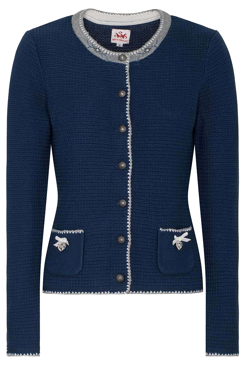 Die dunkelblaue taillierte Damenstrickjacke ROBINIEN von Spieth&Wensky ist aus einem angenehm zu tragendem Gewebe mit 45% Baumwolle hergestellt. Von dem ruhigen einheitlichen Strickmuster hebt sich die grau-weiße Einfassung an Rundkragen, Armsäumen und an den vorderen Eingriffstaschen besonders hervor. Der Rundkragen ist etwas breiter eingesäumt und weist ein filigranes eingesticktes Blumenmuster in blau auf. Die altsilbernen Kugelknöpfe sowie die Herzanhänger mit Schleifchen auf den beiden aufgesetzten Taschen sind ein weiteres hübsches Ausstattungselement.