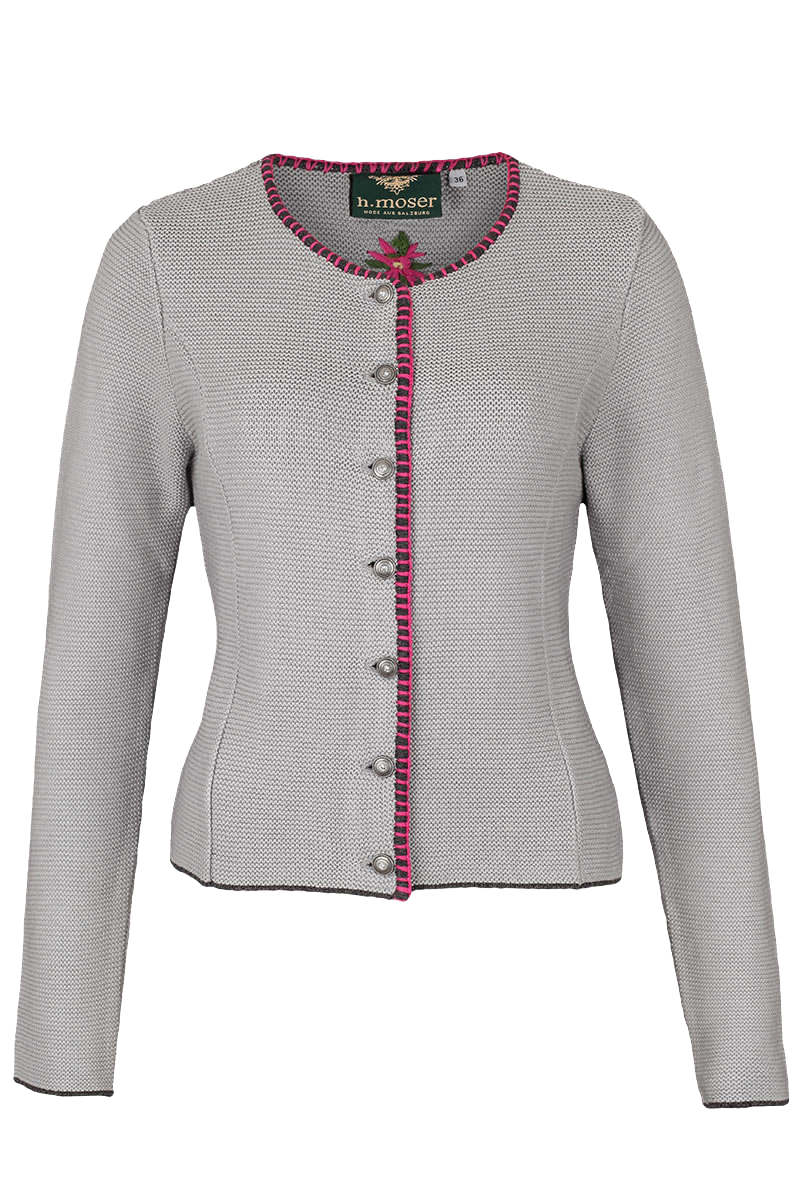 Produktinformationen:Diese klassische Strickjacke ist eher schlicht gehalten. Die dunkelgrauen Abschlüsse der Jacke setzen sich schön vom Körper ab. Der Halsausschnitt und die die Knopfleiste sind zudem mit einer pinken Ziernaht versehen. Im Rücken der Jacke ist eine bunte Blume eingestickt. Zudem ist hier eine Kellerfalte angebracht, die die Jacke auf Figur bringt.Ausstattung:Die Jacke hat einen Rundhalsausschnitt. Sie wird mit kleinen Metallknöpfen geschlossen.Was macht diese Jacke zu Ihrer Lieblingstracht?Durch die Baumwollmischung bietet die Jacke einen hohen Tragekomfort und ist sehr pflegeleicht.Diese Lieblingsstücke lassen sich hierzu perfekt kombinieren:Zu dieser Jacke empfehlen wir Ihnen einen Trachtenrock und ein Trachtenshirt. Auch eine pinke Handtasche und ein Blumenhaarband harmonieren gut mit dieser Jacke.Zu diesen Anlässen können Sie diese Tracht perfekt tragen:Diese Jacke können Sie sehr gut im Alltag tragen. Sie passt perfekt zu einem traditionellen Trachtenoutfit.