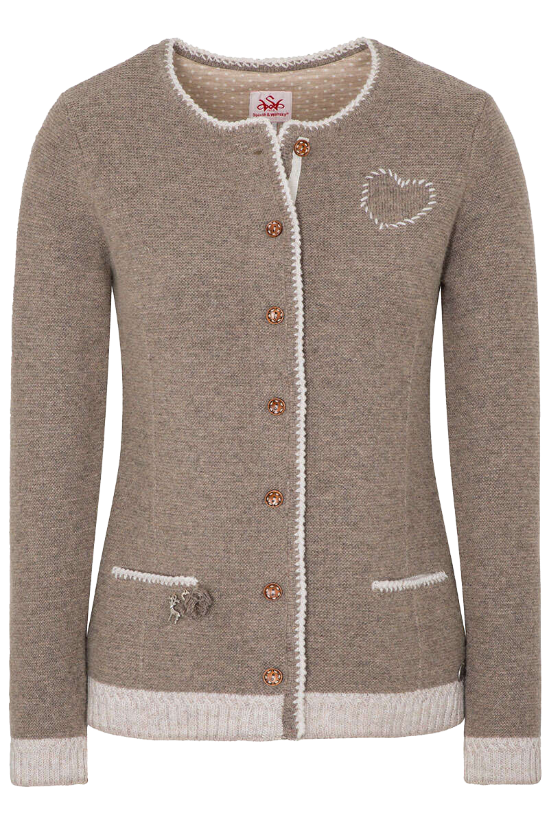 WILLA ist eine schicke Damen-Strickjacke in nussbraun von Spieth&Wensky, die mit viel Liebe zum Detail gefertigt wurde und sowohl zum Dirndl als auch zur Jeans eine gute Figur macht.Zum ruhigen einheitlichen Strickmuster des Korpus bildet der wollweiße Zierrand in gestrickten 'Mäusezähnchen' an der Knopfleiste, den Taschen und um den runden Halsausschnitt einen wunderschönen Kontrast. Armsäume und Bund sind in einem raffiniertem Rippmuster in wollweiß gestrickt, welches ein schönes breites Bündchen bildet.Niedliches Detail: Das kleine Herz mit weißem gestickten Rand links oben im Brustbereich ist in rechten Maschen gestrickt und hebt sich so vom Rest der Jacke dezent ab. Ebenso verhält es sich mit der Ellbogenpartie. Schöne Holzknöpfe sowie die kleinen Schmuckelemente an der rechten Tasche (Hirschanhänger, Herzchen und Quaste) sind weitere hübsche Ausstattungselemente.Der Schnitt ist leicht tailliert.
