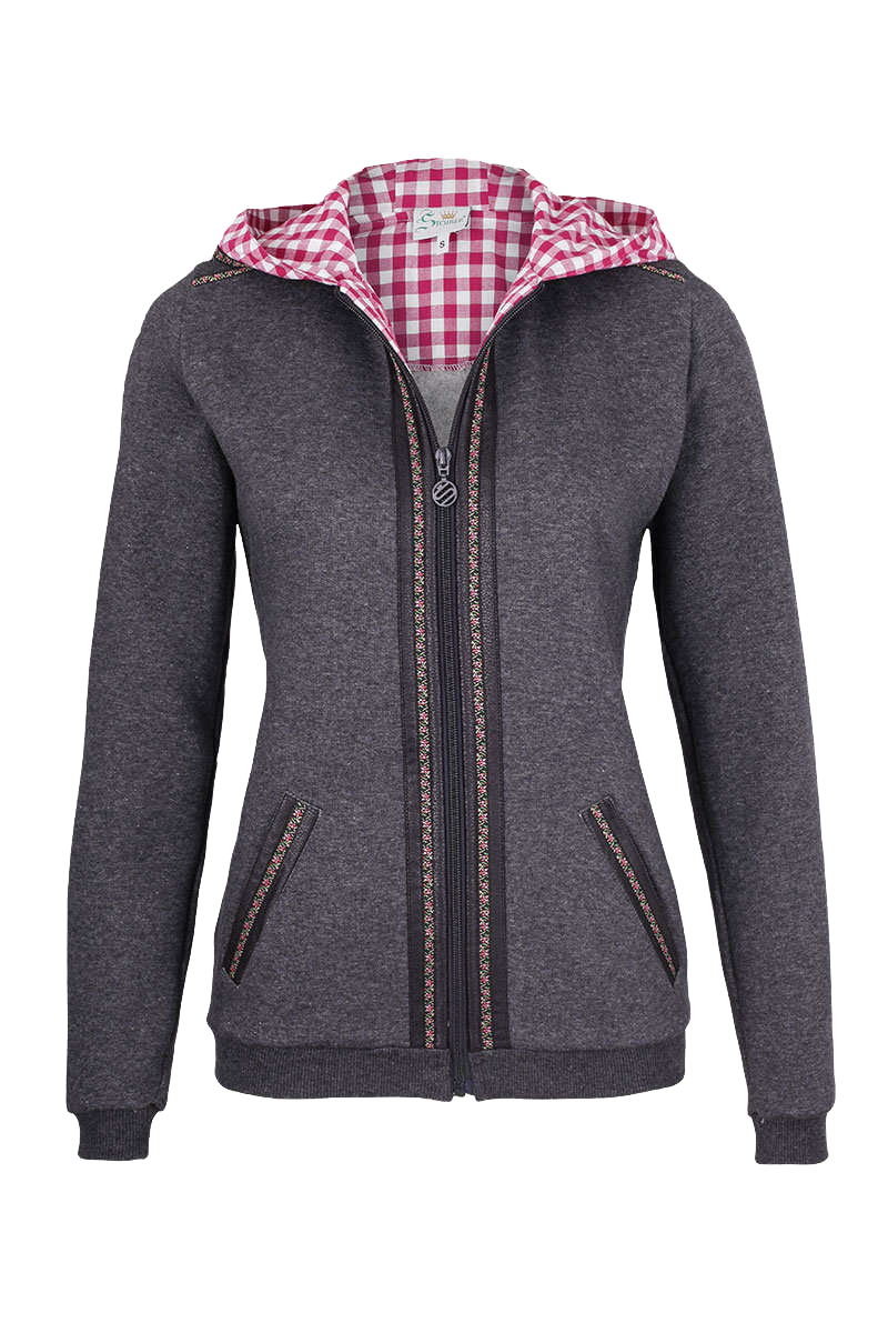 Diese süße Sweatjacke ist der absolute Hingucker. Der tolle Mix aus dem schlichten, melierten Grau und den roten Verzierungen verleiht der Jacke ihren Look. Der Körper der Jacke ist in Grau gearbeitet. Der Abschluss der Reißverschlussleiste, der Abschluss der Kapuze und die Abschlüsse der Einschubtaschen sind mit einem bunten Band und zwei Bändern in Lederoptik eingefasst. Die Kapuze und die Taschen sind mit einem weiß-pink karierten Stoff gefüttert. An der Außenseite der Kapuze ist ebenfalls ein Streifen aus weiß-pink kariertem Stoff angebracht. Geschlossen wird die Jacke vorne mit einem Reißverschluss.