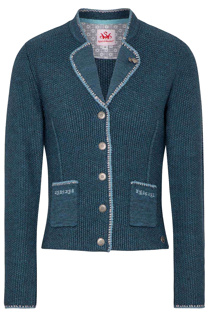 Die figurbetonte Strickjacke im Blazerstil AILEEN von Spieth&Wensky passt perfekt zu Dirndl, Trachtenrock oder Lederhose. Die jeansblaue Farbe lässt sich super kombinieren, weshalb diese Jacke in Ihrem Kleiderschrank nicht fehlen darf. Das Strickmaterial mit hohem Schurwollanteil ist fein verarbeitet. Der Stehkragen und das Revers heben sich durch den feinen Strick leicht ab. Die linke Seite des Revers ist mit einem silberfarbenen Herz und einem Zierknopf verziert. Die zweifarbigen Einfassungen der Strickjacke an Kragen, Knopfleiste, Taschen und Ärmelenden bilden den passenden Farbkontrast. Besonders hübsch sind die floralen Stickereien auf den Taschen. Darüber ist eine vertikale Zierlinie in Zopfstrick eingearbeitet. Auch der Rücken der Trachtenjacke ist stilvoll gestaltet: Die Ellenbogen sind oval mit feinem Strick und einer weißen Zierlinie verziert. In der Mitte befindet sich ein mit hellblauen Blumen bestickter Rechtsstrickriegel, der beidseitig mit einer Zierlinie abschließt.Die Rückenlänge beträgt in Größe S ca. 55 cm.
