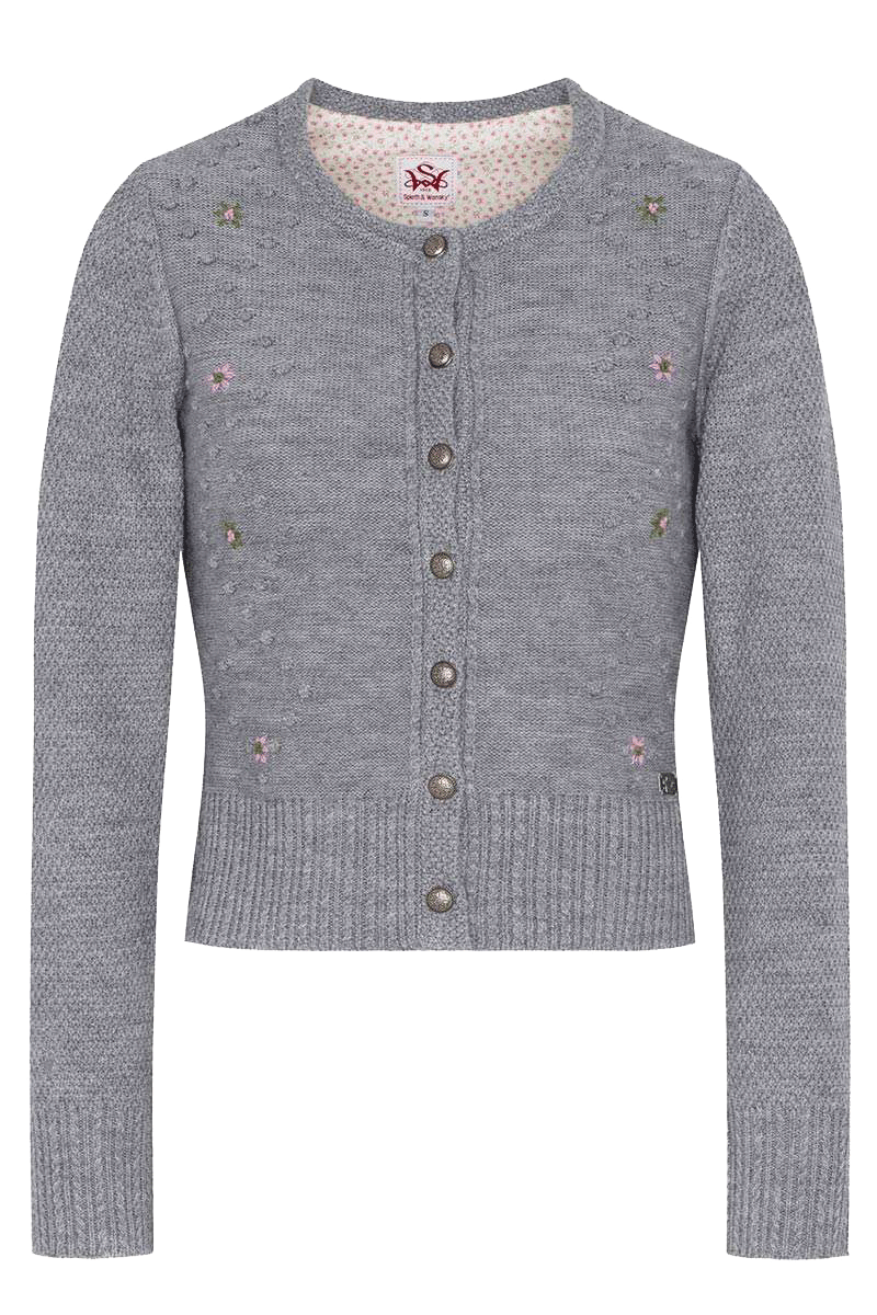Madeira ist eine nostalgische Damenstrickjacke von Spieth & Wensky in Grau. Das Besondere an der Jacke sind die verschiedenen Strickmuster, auffallend ist die Brust mit dem gestrickten Knopfmuster und den farbigen Blüten. Die bis zum Stehkragen reichende Knopfleiste besteht aus runden, gemusterten Metallknöpfen.