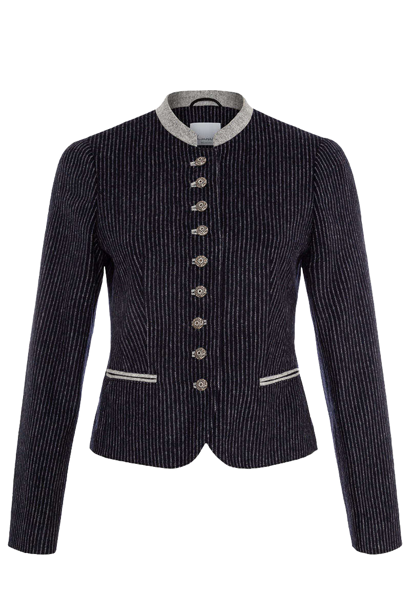 Die Damenjacke Hintertux von h. moser besticht vor allem mit ihrem anschmiegsam weichen Gewebe in Dunkelblau mit schmalem Streifenmuster. Stehkragen, Knopflöcher und Einschubtaschen sind hellgrau paspeliert. Sehr aufwändig gearbeitet sind die runden Metallknöpfe mit fein ziseliertem Muster. Edel gestaltet ist auch der Rücken mit den Wiener Nähten und dem an der Taille eingearbeiteten Einsatz mit Quetschfalte. Die Innenseite ist vollständig mit hellgrauem Futter ausgestattet. Maße bei Größe 34: Rückenlänge 50cm, Ärmellänge 59 cm.