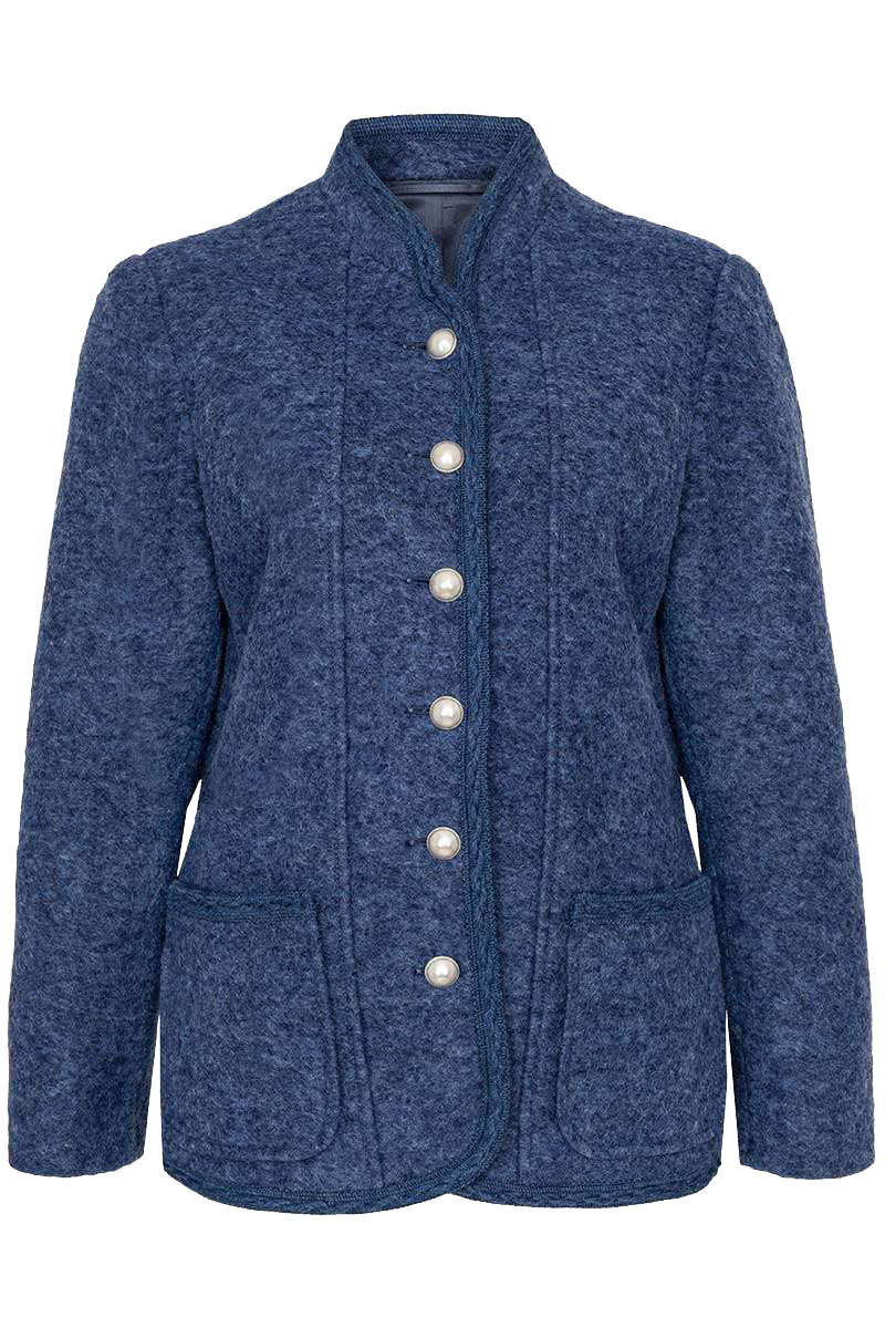 Eine blaue Damenjacke aus angenehm weichem Wollmischgewebe in Walkoptik. Der gerade klassische Schnitt mit Stehkragen mit hoch geschlossener Knopfleiste und aufgesetzten Taschen ausgeführt. In Größe 38 beträgt die Rückenlänge 61 cm und die Armlänge 60 cm. Das Gewebe besteht zu 67 % aus Wolle und 33 % Polyester, das rundum eingesetzte Futter aus 100 % Acetat. Die Jacke kann ideal als Übergangsjacke getragen werden.