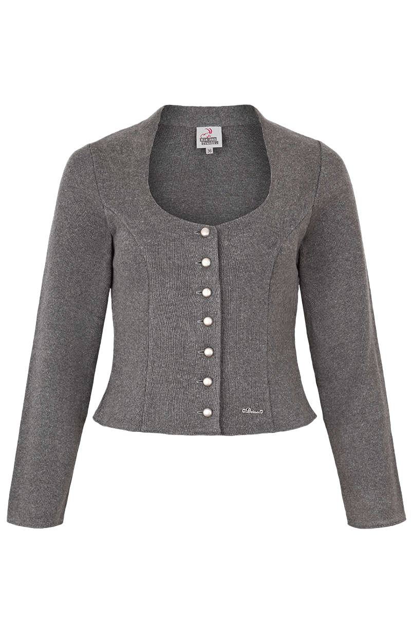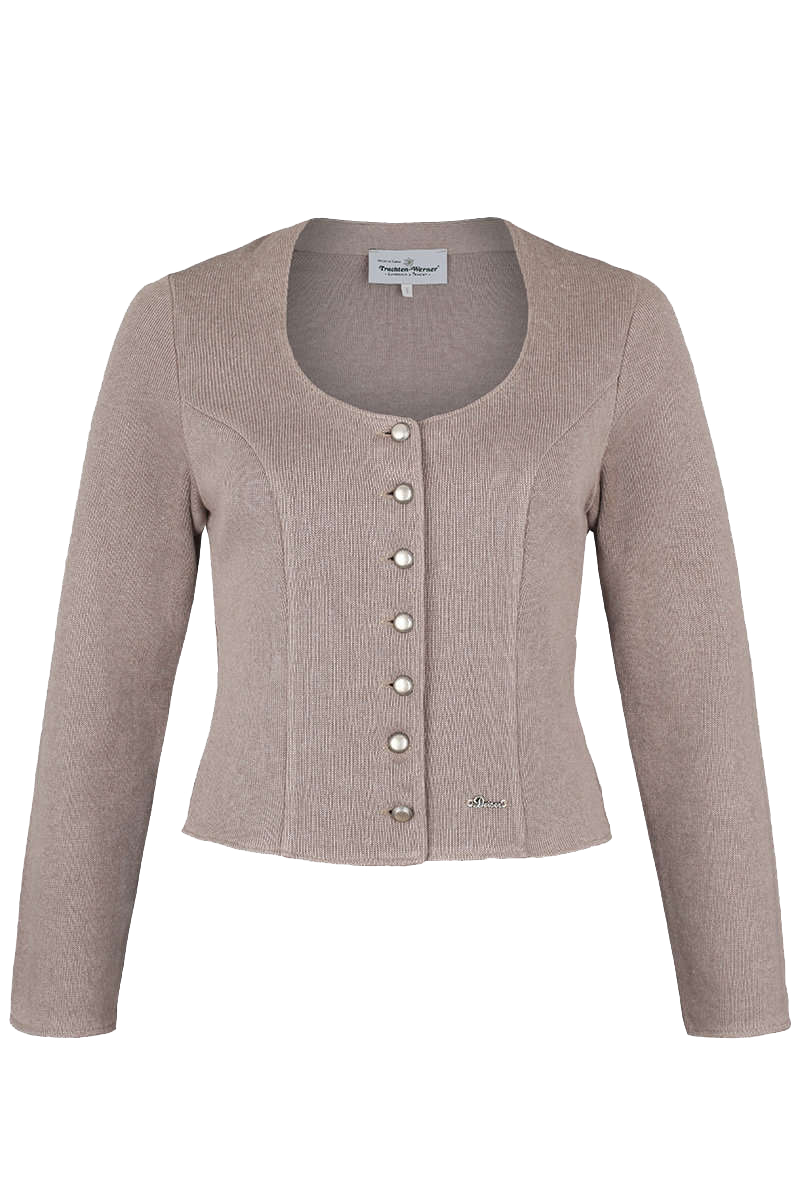Diese klassische und zeitlose, kurze beige Strickjacke aus angenehmer Baumwoll-Mischung passt hervorragend zum Dirndl, kann aber auch sportlich zur Jeans kombiniert werden. Ihre schlichte Eleganz wird durch den kleinen Stehkragen und den tollen Rundhalsausschnitt der Jacke unterstrichen. Die Taillenabnäher gewährleisten den perfekten Sitz dieser Jacke. Im Rücken ist die Jacke in der Mitte in Falten gelegt, so entsteht ein kleines Schößchen. Die kleinen Metallknöpfe runden das harmonische Bild der Jacke ab. Diese niedliche Trachtenjacke lässt sich gut zu Dirndl und Dirndlbluse mit Stehkragen kombinieren. Ein passendes Trachtencollier bringt Ihr Dekolleté noch mehr zum strahlen.