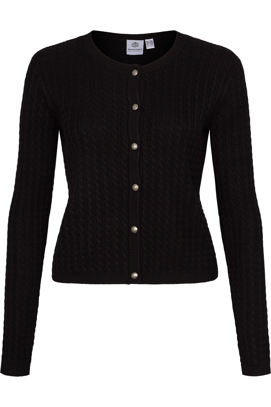 Die durchgehende Knopfleiste mit runden Metallknöpfen in Altsilberoptik führt bis zum Rundhalsausschnitt und unterstreicht den trachtigen Charakter der Jacke. Der gerade Schnitt sorgt für eine bequeme Passform und lässt sich vielseitig kombinieren – ob zur Trachtenbluse, zum Dirndl oder ganz modern zur Jeans.