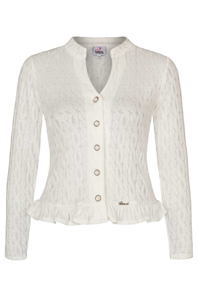 Die weiße Strickjacke DANI von Mia san Tracht hat ein romantisches Design mit Rüschen am Saum und V-Ausschnitt. Sie ist gleichmäßig im Zopfmuster gestrickt und eignet sich perfekt zur Hochzeit beim Tragen eines Brautdirndls.Der hübsche Stehkragen geht in einen kurzen V-Ausschnitt über, an den sich die Knopfleiste mit silbern schimmernden Knöpfen anschließt. Die Knöpfe sind mit weißen Steinen besetzt.Ob zur Hochzeit in Tracht, zur Trachtenbluse oder im Alltag: die Strickjacke ist ein echter Hingucker und durch das weiche Material sehr angenehm zu tragen.In Größe 34 beträgt die Rückenlänge ca. 51 cm und die Ärmellänge ca. 55 cm.