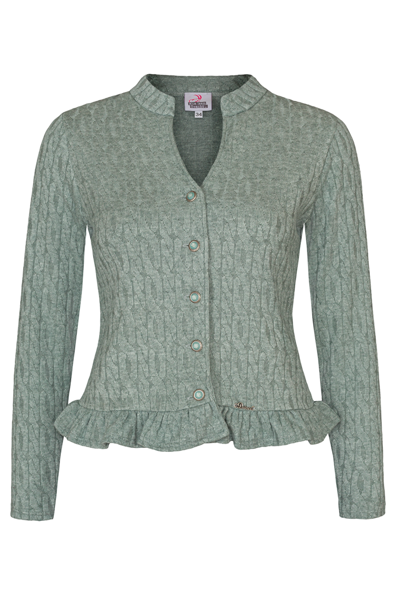 Die mintgrüne Strickjacke DANI von Mia san Tracht hat ein romantisches Design mit Rüschen am Saum und V-Ausschnitt. Sie ist gleichmäßig im Zopfmuster gestrickt.Der hübsche Stehkragen geht in einen kurzen V-Ausschnitt über, an den sich die Knopfleiste mit silbern schimmernden Knöpfen anschließt. Die Knöpfe sind mit Steinen in der Farbe der Jacke besetzt und mit einer weißen Blüte bedruckt.Ob zum Dirndl, zur Trachtenbluse oder im Alltag: die Strickjacke ist ein echter Hingucker und durch das weiche Material sehr angenehm zu tragen.In Größe 34 beträgt die Rückenlänge ca. 51 cm und die Ärmellänge ca. 55 cm.