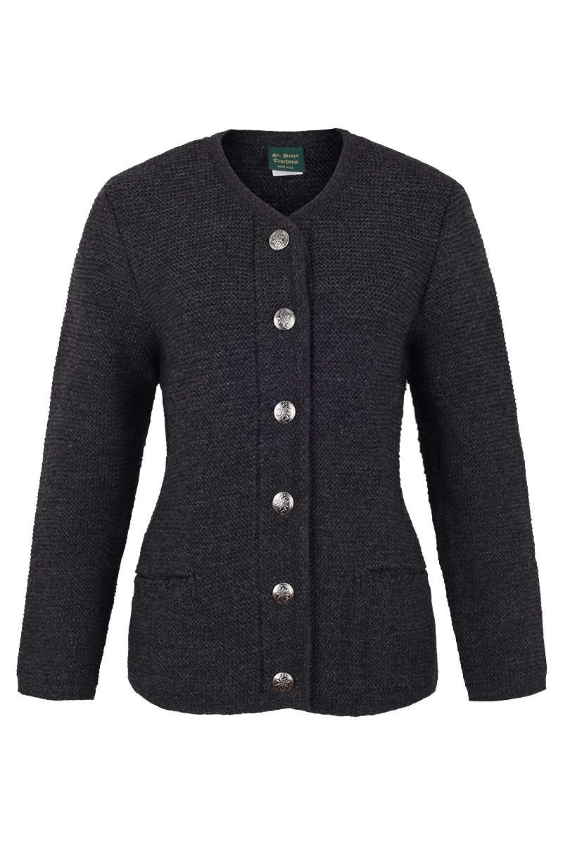 Diese klassische und zeitlose, Trachtentrickjacke aus angenehmer Woll-Mischung passt hervorragend zum Dirndl, kann aber auch sportlich zur Jeans kombiniert werden. Die Jacke ist tailliert geschnitten und mit zwei Einschubtaschen versehen. Die Teilungsnaht im Rücken ist abgesetzt. Die großen metallknöpfe mit Edelweiß-Motiv runden das harmonische Bild der Jacke ab.