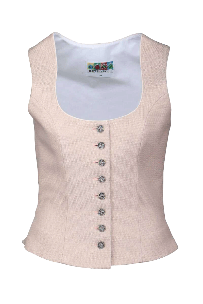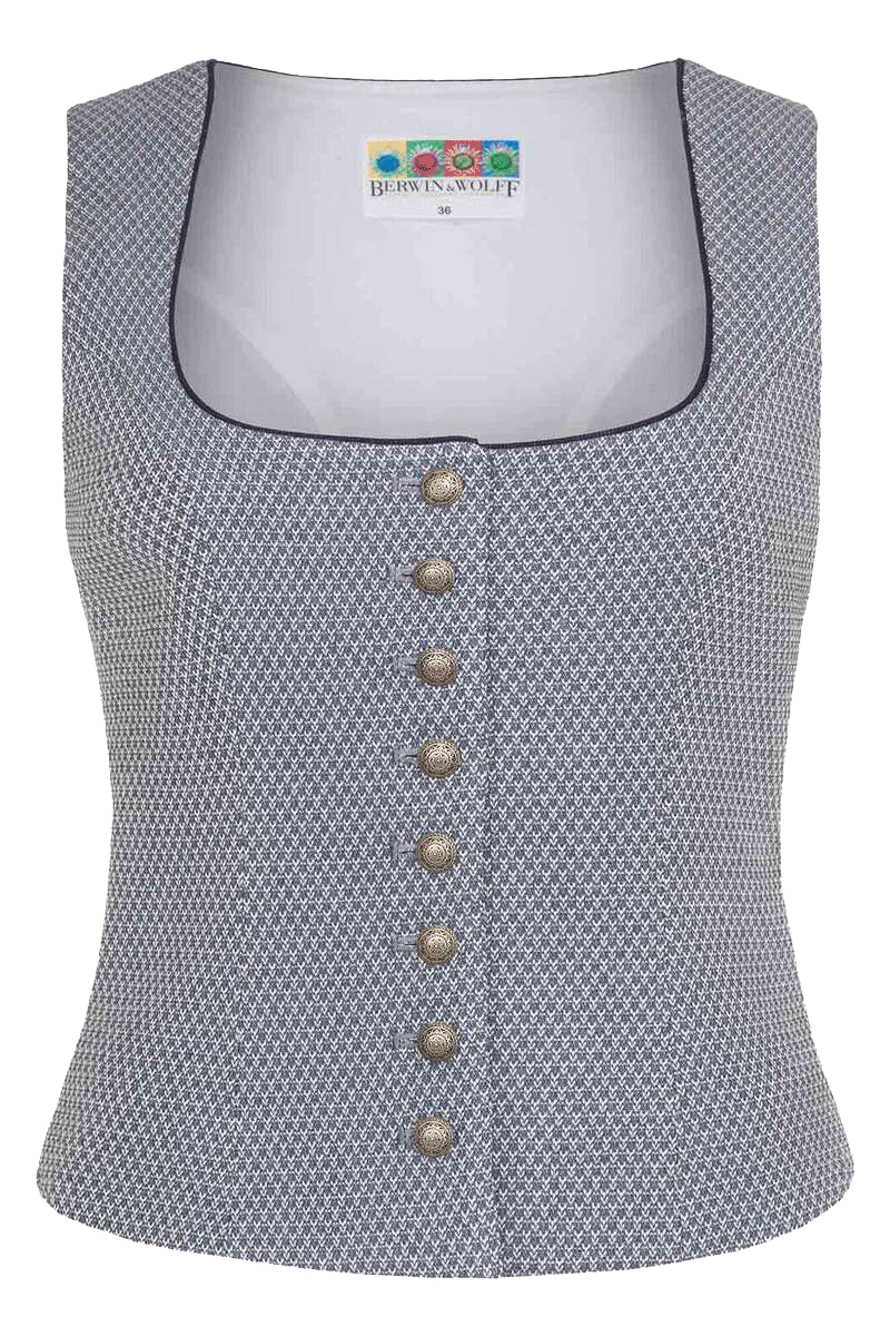 Dieses wunderschön gemusterte Mieder von Berwin & Wolff ist ein zeitloser Klassiker, der sich wunderbar kombinieren lässt. Der blaue Oberstoff besteht aus einem Baumwollmischgewebe und ist mit einem zarten Muster mit hellen Akzenten versehen. Der Ausschnitt ist mit einer dunkelblauen Leinenpaspel eingefasst. Die Wiener Nähte sorgen für einen figurbetonten Schnitt und eine schöne, feminine Silhouette.Das Besondere ist das kleine Schößchen auf der Rückseite, das den traditionellen Stil unterstreicht. Das schöne Blau lässt sich wunderbar zum Trachtenrock oder zur Hose kombinieren. Durch die hochwertige Verarbeitung des Mieders werden Sie lange Freude an diesem Trachtenoberteil haben.