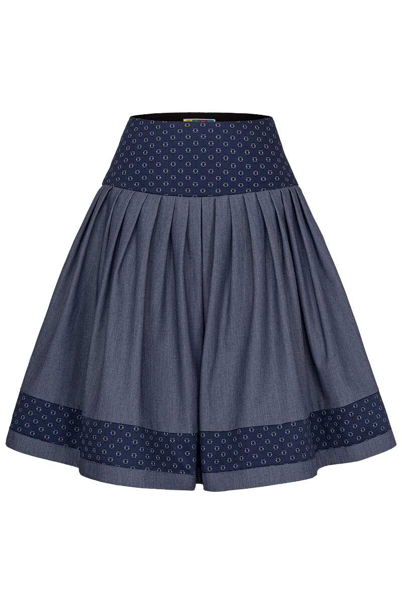Dieser schicke blaue Rock der Marke Berwin & Wolff mit tollen aufgenähten Verzierungen an Bund und Rocksaum aus dunklerem blauen Stoff mit wunderschönen kleinen dunkelblau-weißen Blüten ist durch seine schlichte Eleganz und hohe Verarbeitungsqualität ein absolut alltagstaugliches Kleidungsstück, das Sie für ein schickes Outfit im Büro genauso anziehen können wie zu einer privaten Feier oder in der Freizeit - und das Sommer wie Winter, denn auch im Winter mit warmer Strumpfhose und dickem Daunenmantel darüber wird dieser Rock Sie einfach glücklich machen, weil Sie sich so rundum wohl darin fühlen werden.Das liegt nicht nur an dem hohen Tragekomfort dieses bequemen Glockenrocks, sondern auch daran, dass der Spruch "Kleider machen Leute" schon stimmt, und wenn man als Frau etwas wirklich Schickes im Alltag trägt, fühlt man sich auch wirklich wohler und selbstbewusster.Deswegen ist es immer eine hervorragende Investition, in so wunderschöne, hochwertige Röcke wie diesen hier zu investieren, die es leider nur noch selten gibt. Sie werden sicher jahrzehntelang Freude mit diesem schönen Rock haben.Die Rocklänge in Größe 36 beträgt 57 cm, ab dem Bundsaum gerechnet.