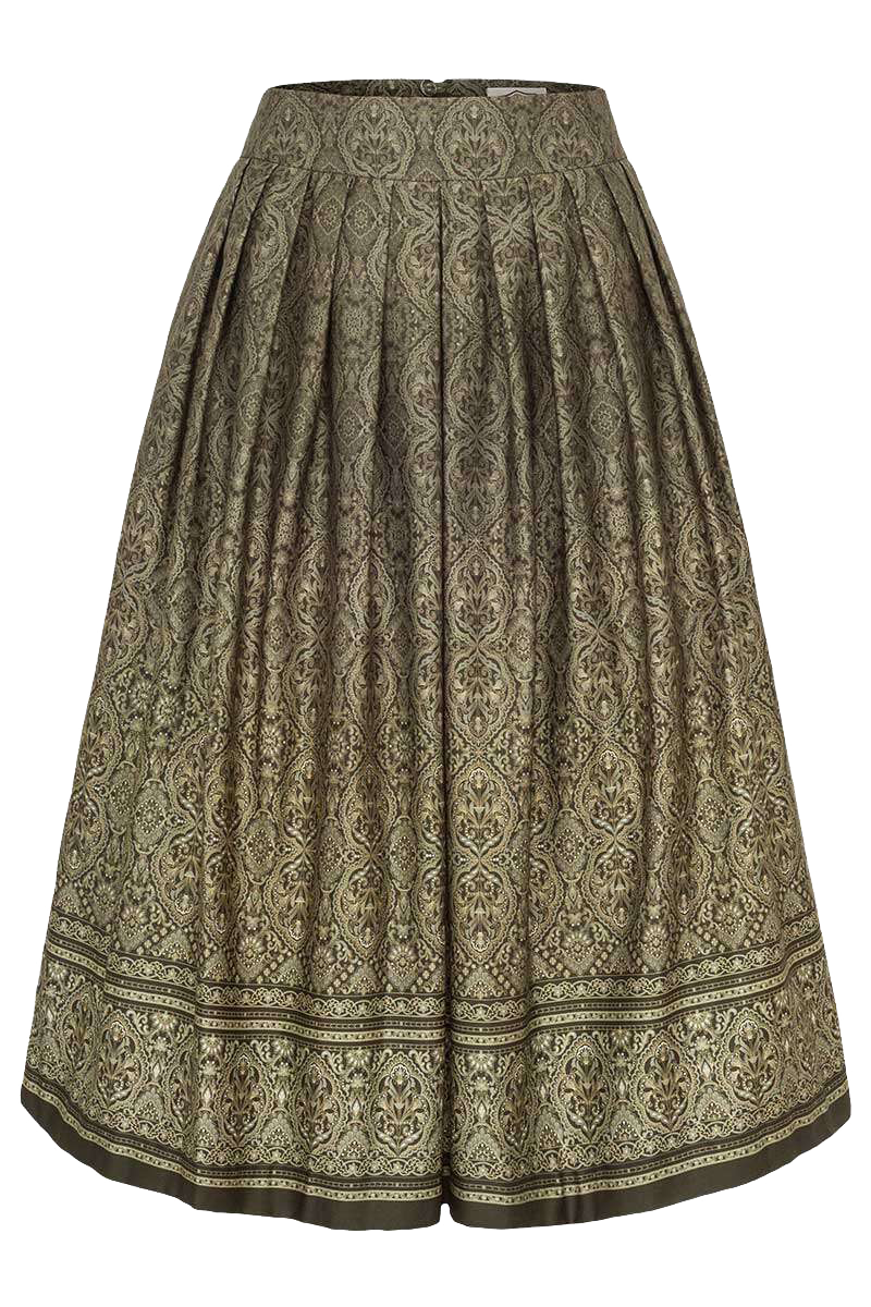 Der festliche dunkelgrüne Faltenrock der Marke 'Apple of my eye' besticht mit seinem herrlichem floralem Ornament-Muster. Während das schnörkelreiche Muster oben eher blass beginnt werden die Farben grün, beige und goldgelb zum Rocksaum hin immer kräftiger. Der Rock wird hinten mit einem Reißverschluss und einem verdecktem Knopf geschlossen. In Größe 36 beträgt die Rocklänge circa 75 cm.